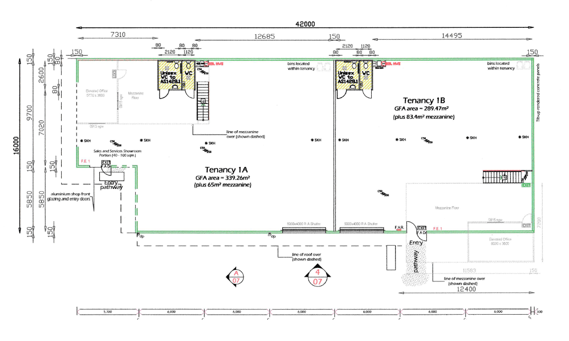 Shed 1B – 289 sqm* ground floor warehouse, with high-clearance electric roller door, plus 84 sqm* mezzanine and office space.
