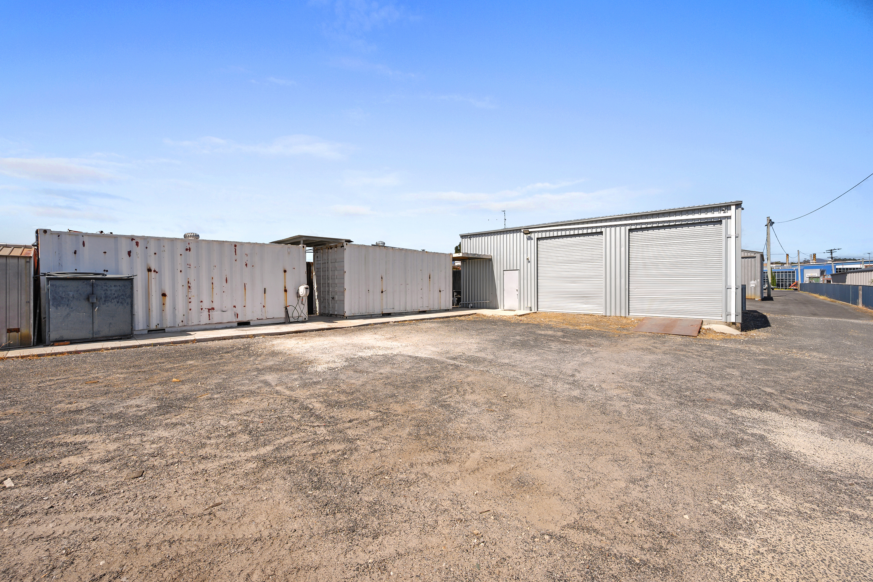 Additional features include two external 20 ft shipping containers, providing valuable on-site storage.