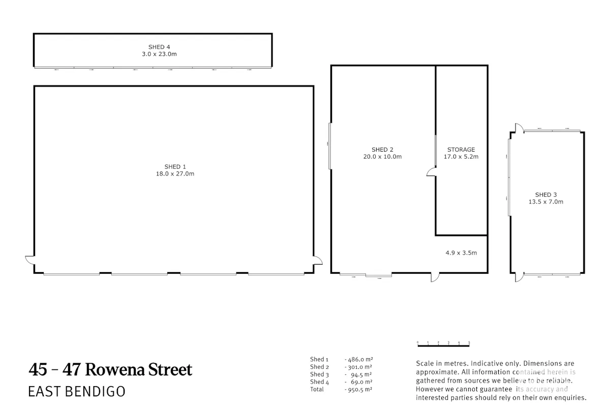 Each of the three buildings offer large open spans, the largest being 18m x 27m and featuring a 9m height and four automatic doors with 5m x 5m clearances. The second building has an open span area of 20m x 10m and a 17m x 5.2m storage area. The third building has an open span of 13.5m x 7m, and there is a 23m x 3m storage shed.