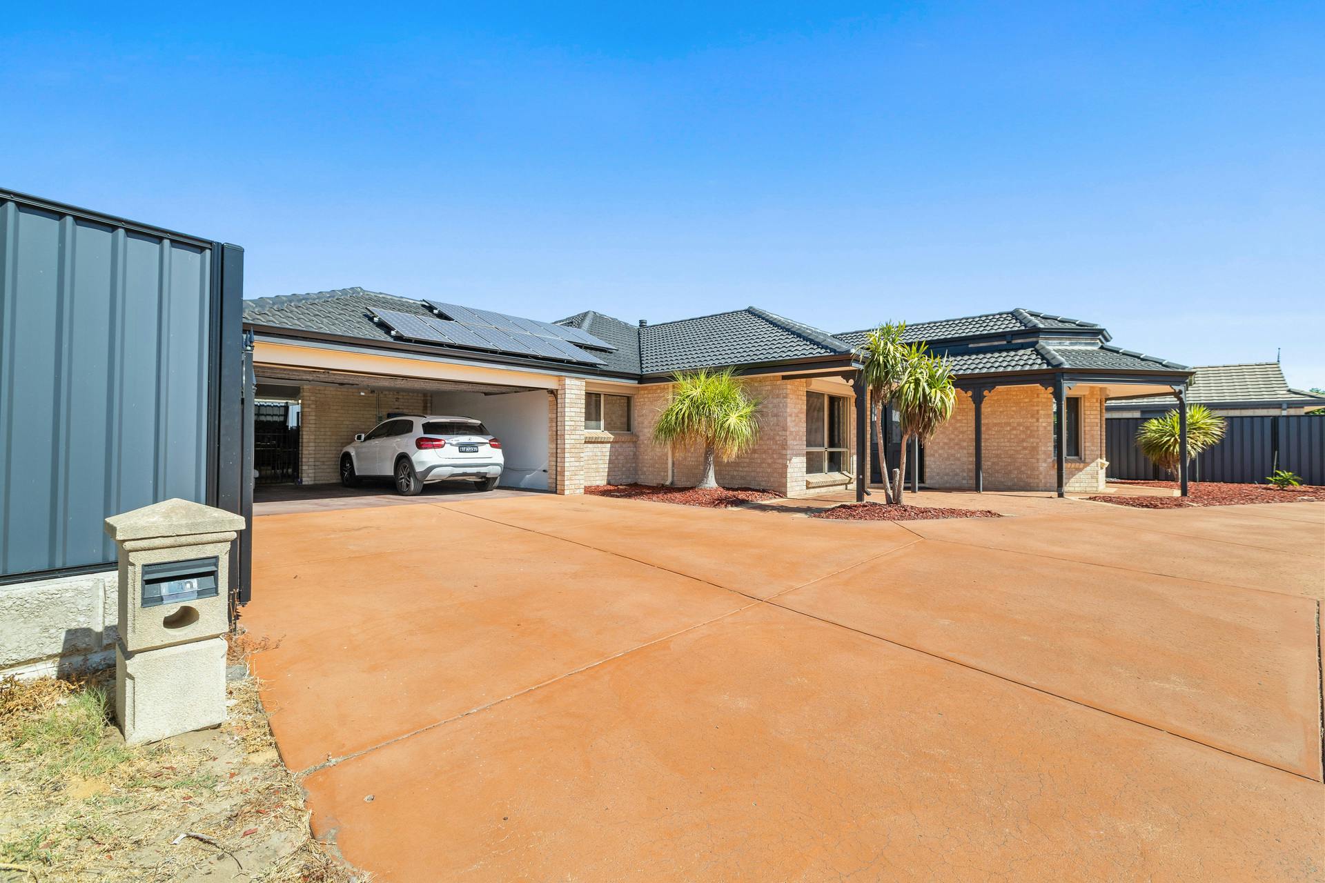 From the front facade, the appeal is there, with a stunning, sleek black roof and gutters, a contrast to the limestone brick. With electric roller shutters across the entire front of the home, protecting you from the afternoon sun.