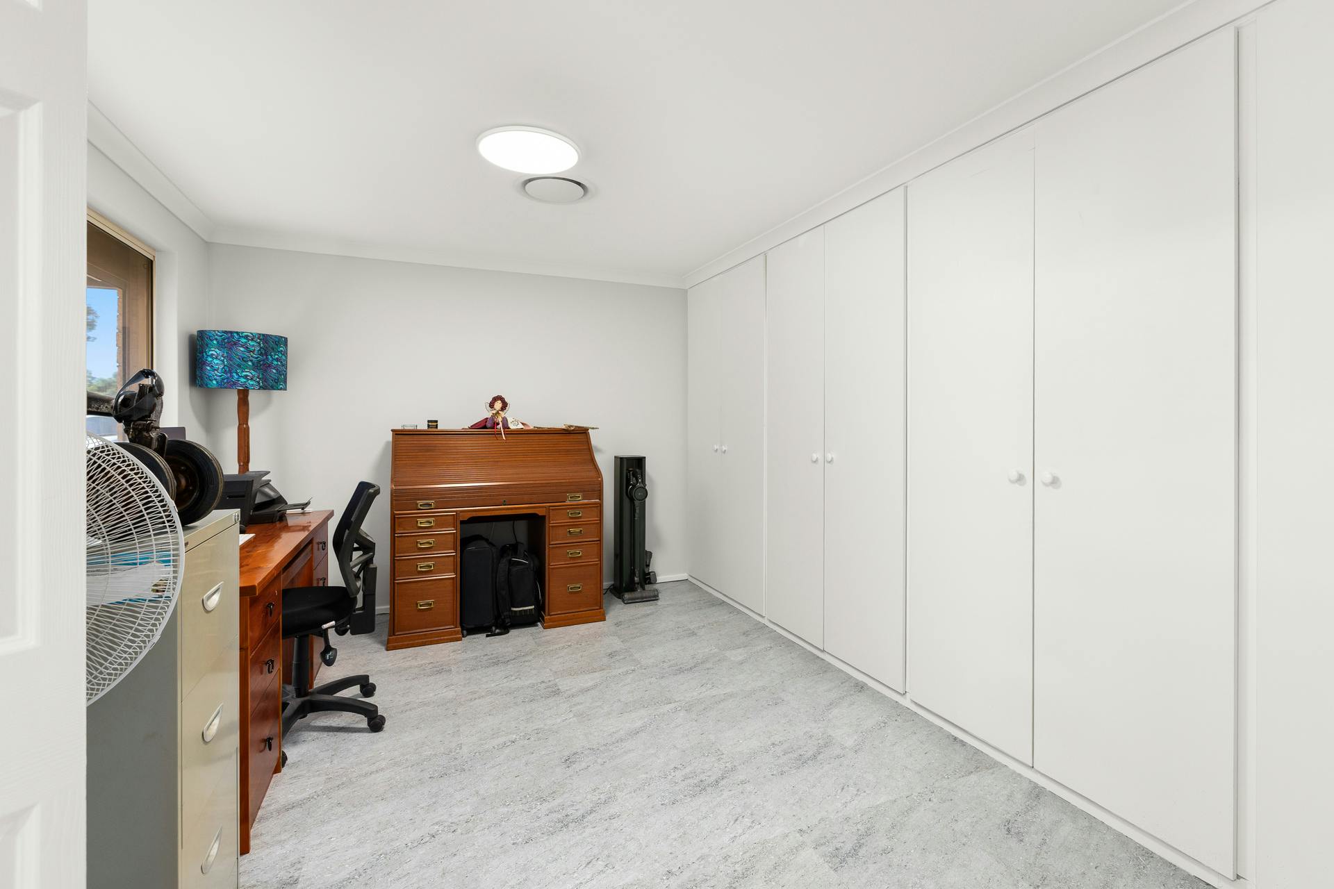 Walking into the home, what was once the theatre room, has had a full wall of built-in cupboards added, making it the ideal home office or a fifth bedroom.