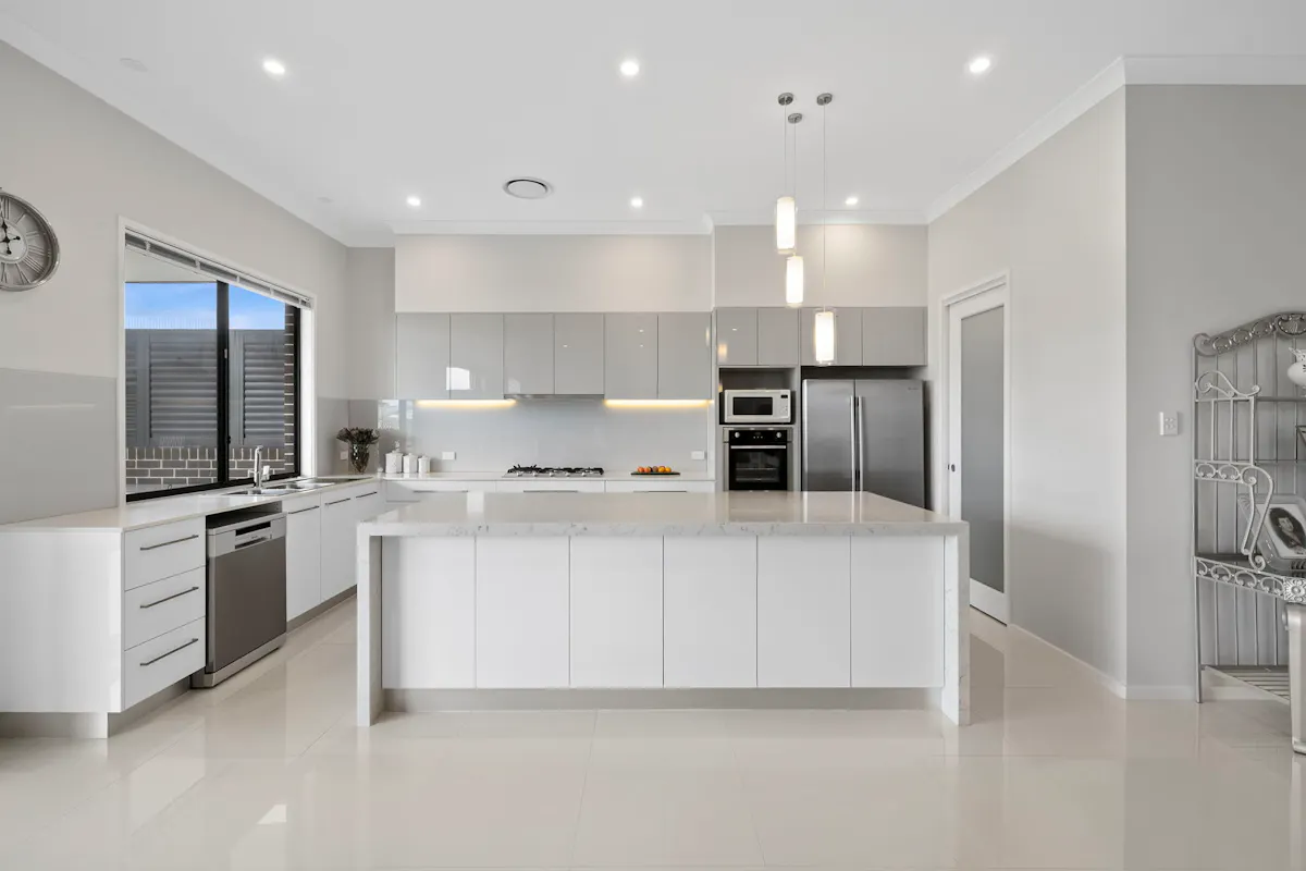 At the heart of the home, the open plan kitchen impresses with a central island, extensive storage, stone benchtops, quality appliances and a walk in pantry.
