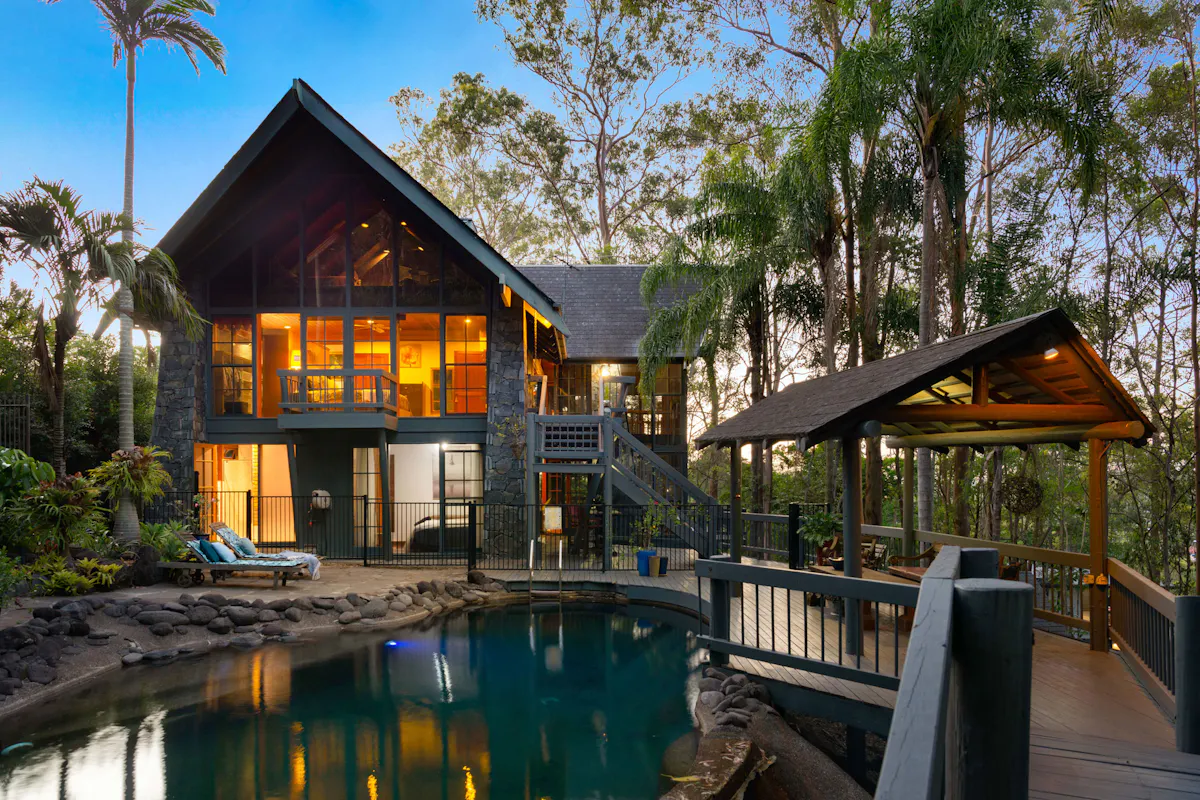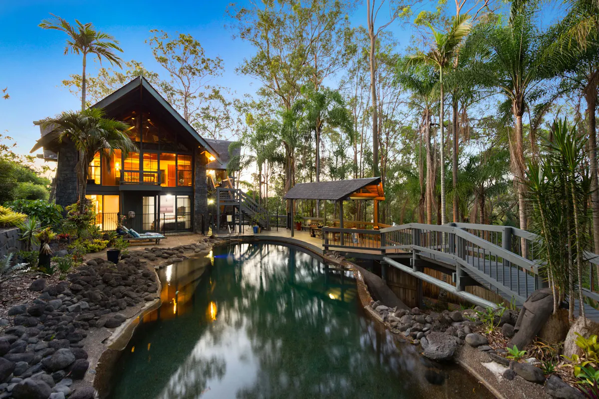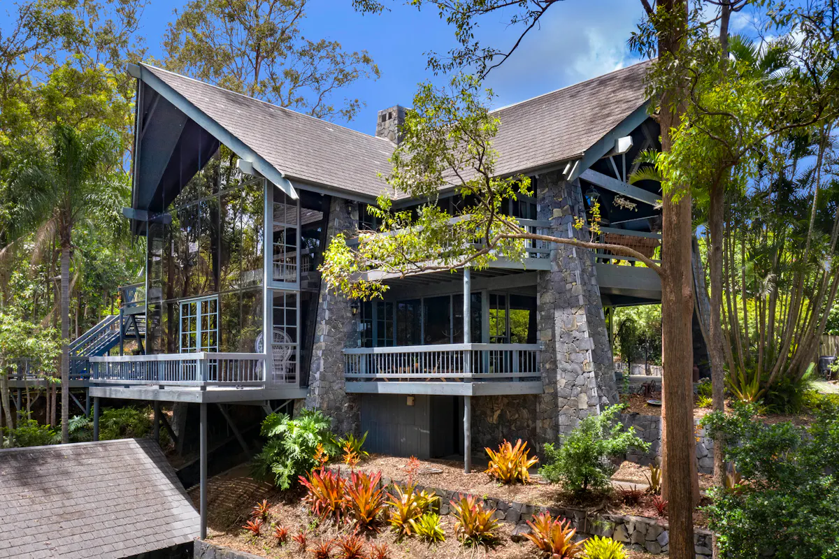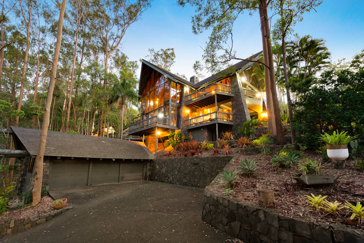 Nestled into the side of Hideaway Mountain, with a north east aspect, this beautiful haven from multi award-winning architect Donald Spencer merges creative artistry and superb craftsmanship with glorious natural mountain surroundings.Sweep off Plantain Road into a private estate. Drive up the 300m driveway, only four minutes from the Pacific Motorway and feel miles away from the hustle and bustle amongst 5,364m2 of natural beauty. Relish life in a dwelling with expansive decks, magnificent vaulted ceilings and floor to ceiling glass framing spectacular views of serene bushland. The 45-degree pitched ceilings rise to 5.8m at the heart of the central living space, allowing light to flood in from the 3-storey bank of windows at the front of the house.