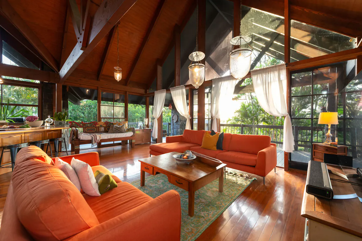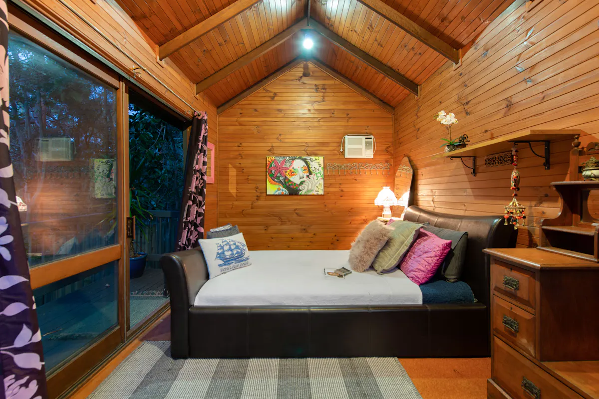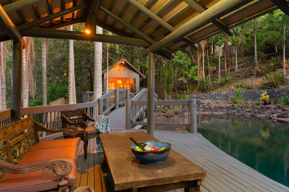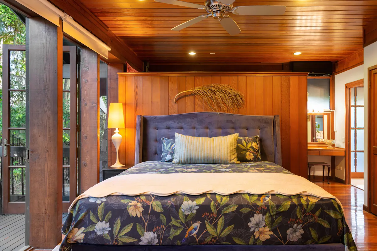 Nestled into the side of Hideaway Mountain, with a north east aspect, this beautiful haven from multi award-winning architect Donald Spencer merges creative artistry and superb craftsmanship with glorious natural mountain surroundings.Sweep off Plantain Road into a private estate. Drive up the 300m driveway, only four minutes from the Pacific Motorway and feel miles away from the hustle and bustle amongst 5,364m2 of natural beauty. Relish life in a dwelling with expansive decks, magnificent vaulted ceilings and floor to ceiling glass framing spectacular views of serene bushland. The 45-degree pitched ceilings rise to 5.8m at the heart of the central living space, allowing light to flood in from the 3-storey bank of windows at the front of the house.