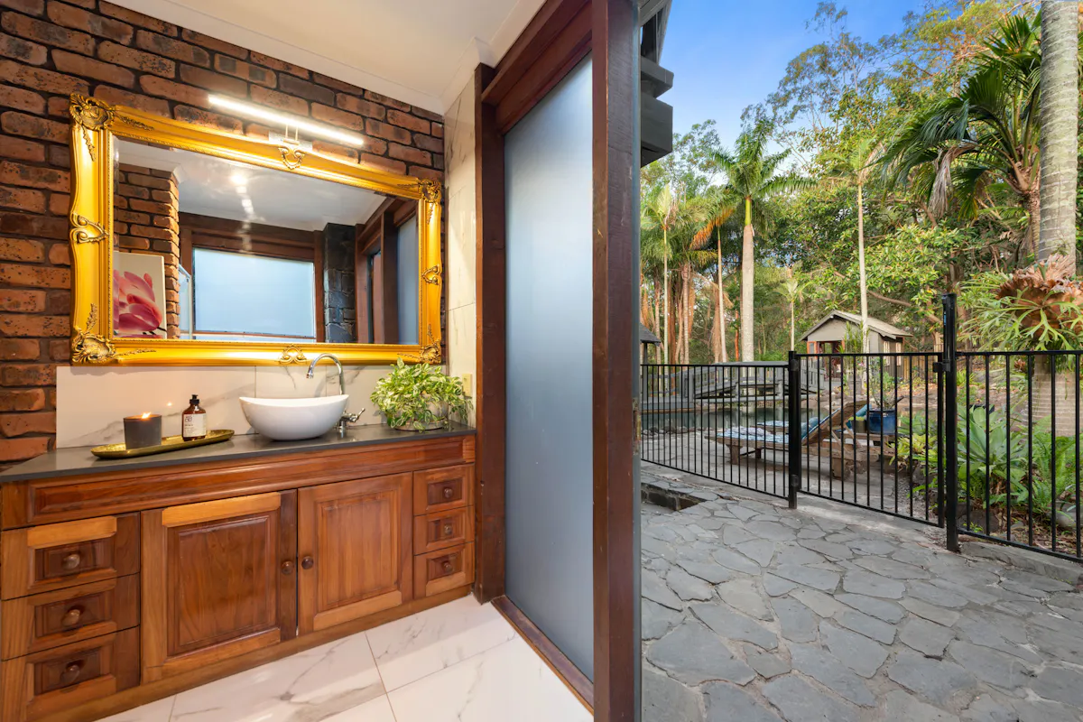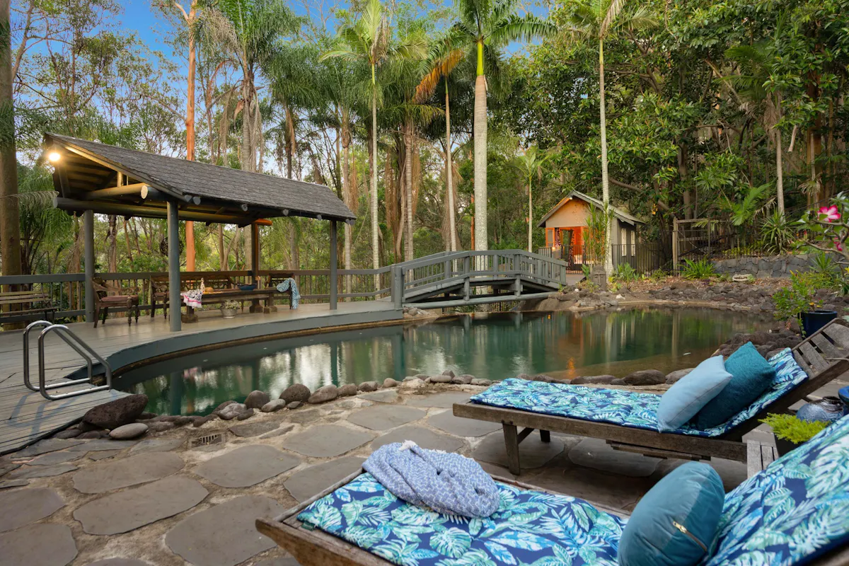 The outdoors is equally memorable with a150,000 litre natural pool with waterfall and grotto, and a bridge leading to the pool house. This would make an ideal artist studio. The current owners have completed extensive renovations and upgrades of the properties high-end features.