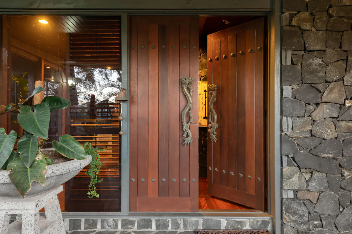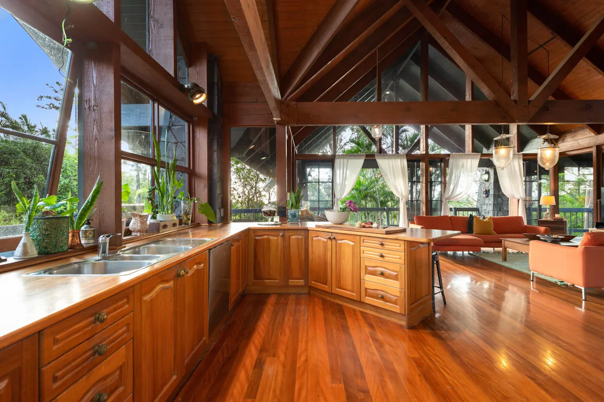 Further into the house, the wood features, like the kitchen cabinets and hardwood flooring are part of a simple material palette, that is consistent both inside and out. Wide Western Red Cedar framed doors create a warm ambience and all the privacy you could envision. This home really boasts the most.