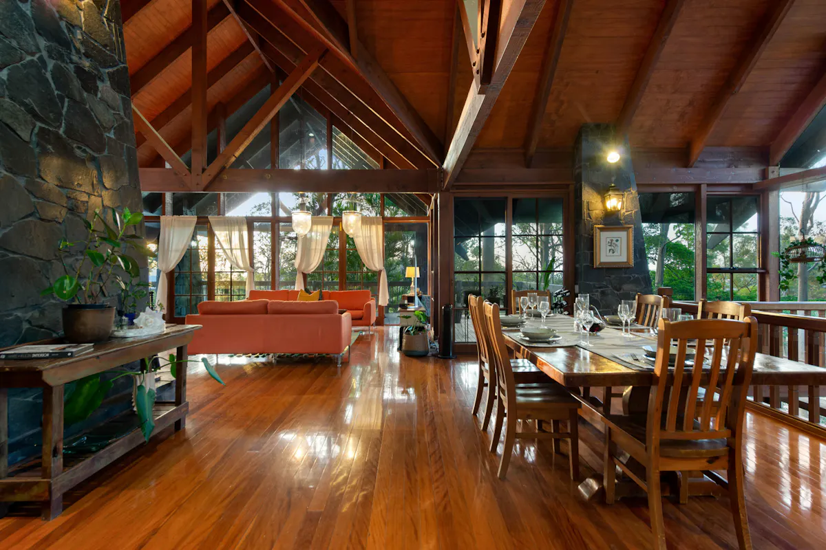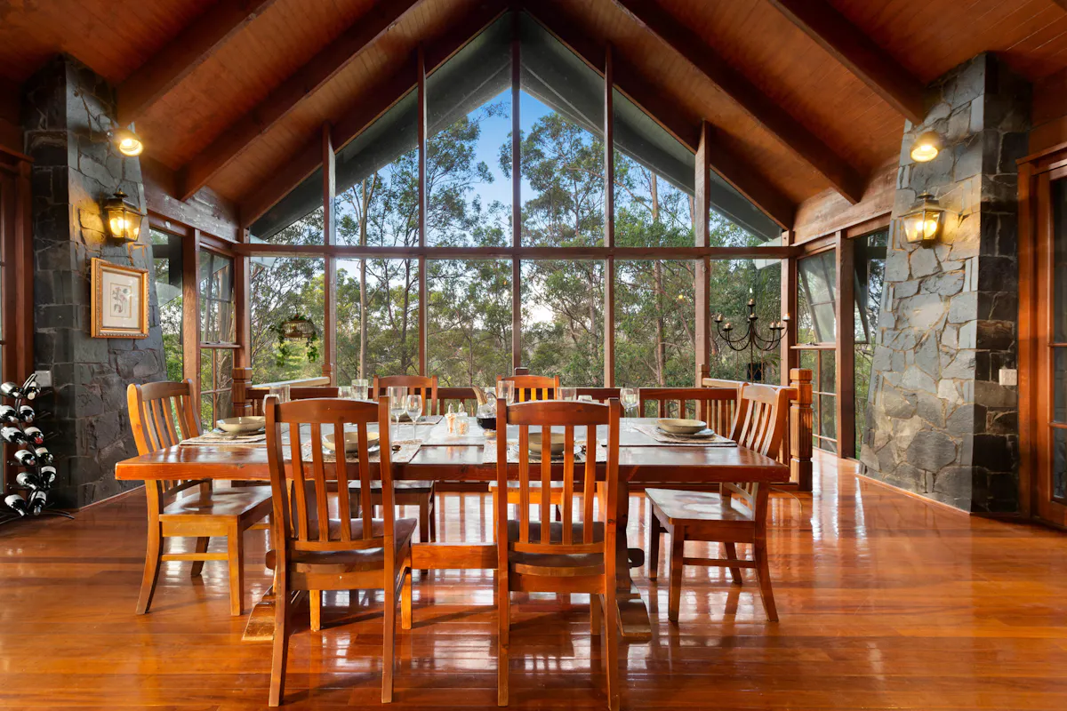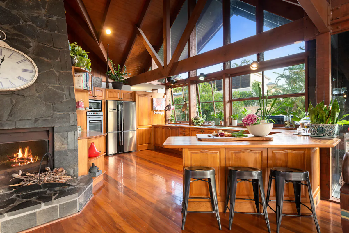 This five-level home, was inspired by a German Chalet. The structure is anchored by eight, three storey tapered stone columns and central chimney with fireplaces on two levels. This architectural feat was meticulously constructed by a team of stone masons over 6 months for the owner of Wilson Constructions, Jim Wilson in the late 1980's. Other unique structural features include, solid timber beams and trusses that support 360-degree, 25mm thick glass walls. The design culminates in a 3 storey, 7.2 m wide window wall facing beautiful Venman Bushland National Park Peaks.