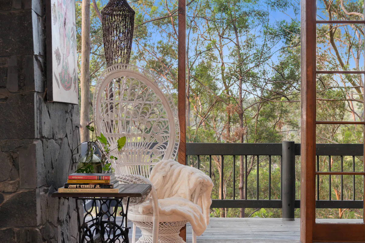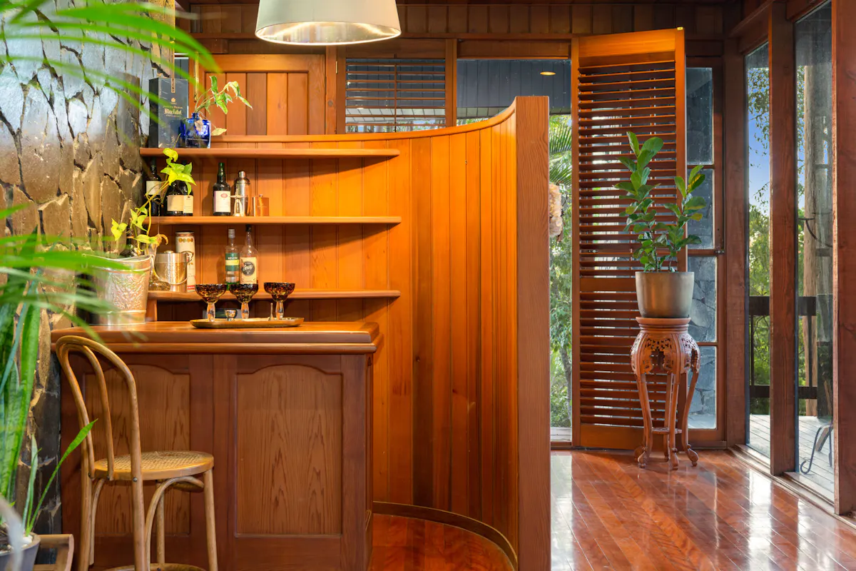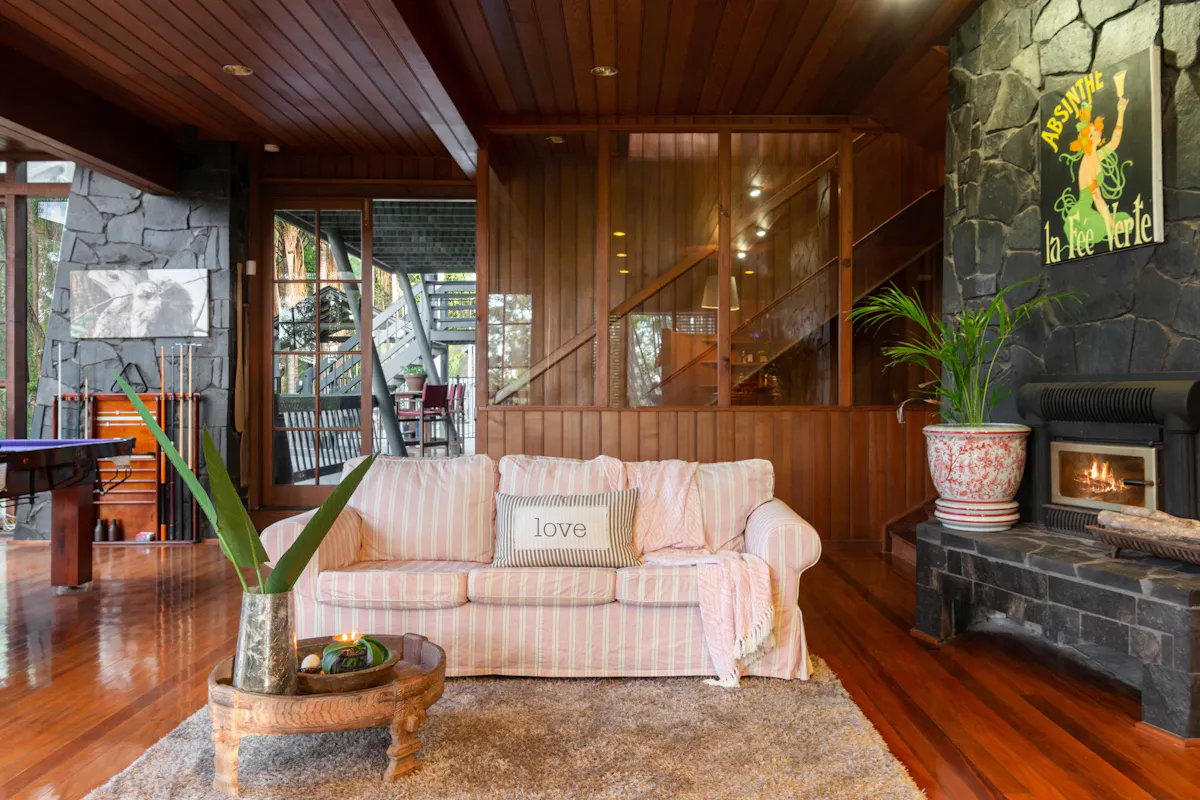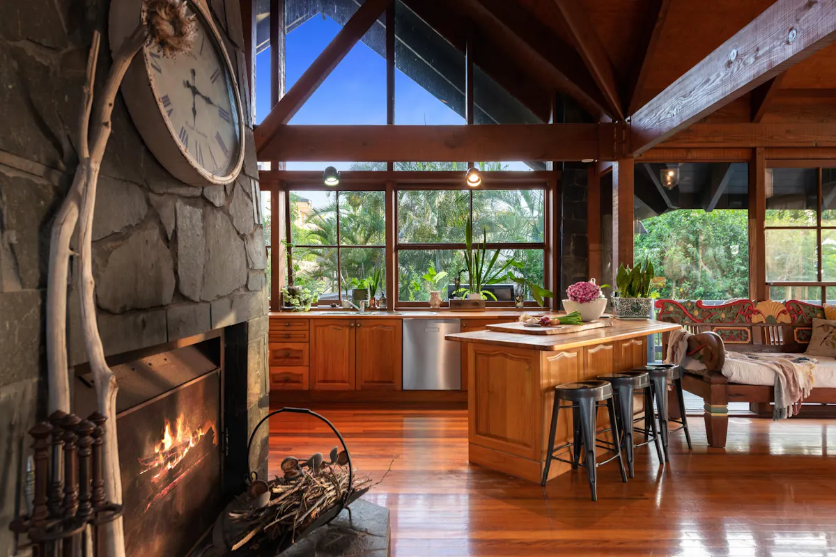 This five-level home, was inspired by a German Chalet. The structure is anchored by eight, three storey tapered stone columns and central chimney with fireplaces on two levels. This architectural feat was meticulously constructed by a team of stone masons over 6 months for the owner of Wilson Constructions, Jim Wilson in the late 1980's. Other unique structural features include, solid timber beams and trusses that support 360-degree, 25mm thick glass walls. The design culminates in a 3 storey, 7.2 m wide window wall facing beautiful Venman Bushland National Park Peaks.
