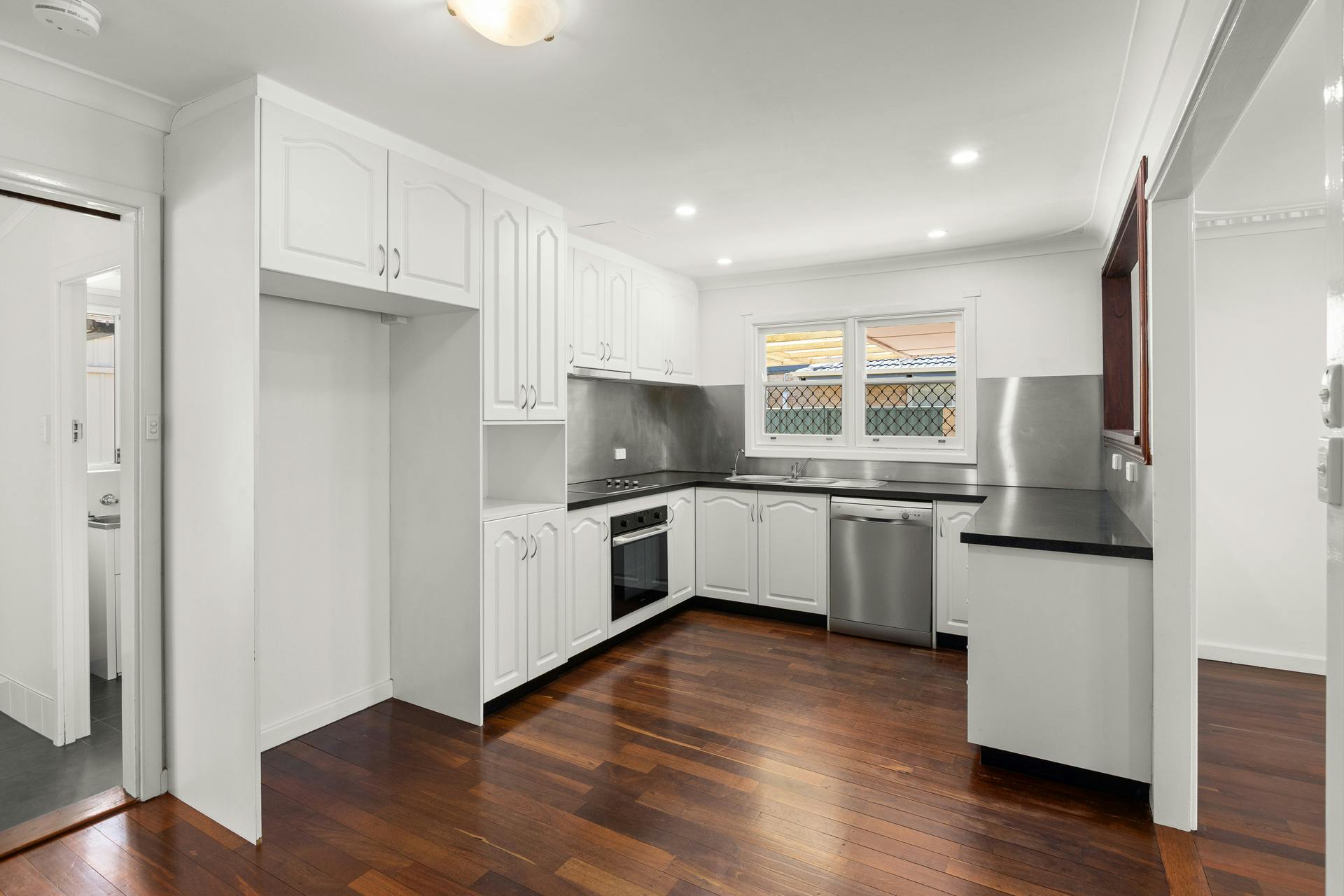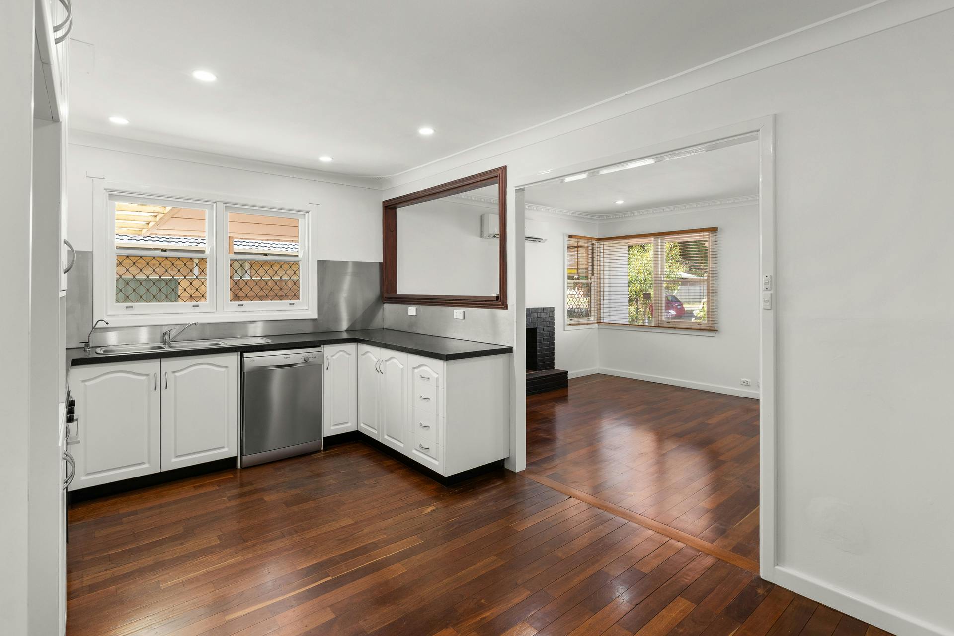 The lounge has been opened up with a viewing window into the kitchen, adding an extra dimension of space to the living areas… And a stunning kitchen it is! Renovated in crisp, clean white cabinetry, a stunning contrast to the beautiful black tops. With updated appliances, including a stainless steel dishwasher, under bench oven, and the easy to clean glass cooktop, it even has a pull-out rangehood, the perfect sized fridge recess for today's two door fridges, and of course a pantry.