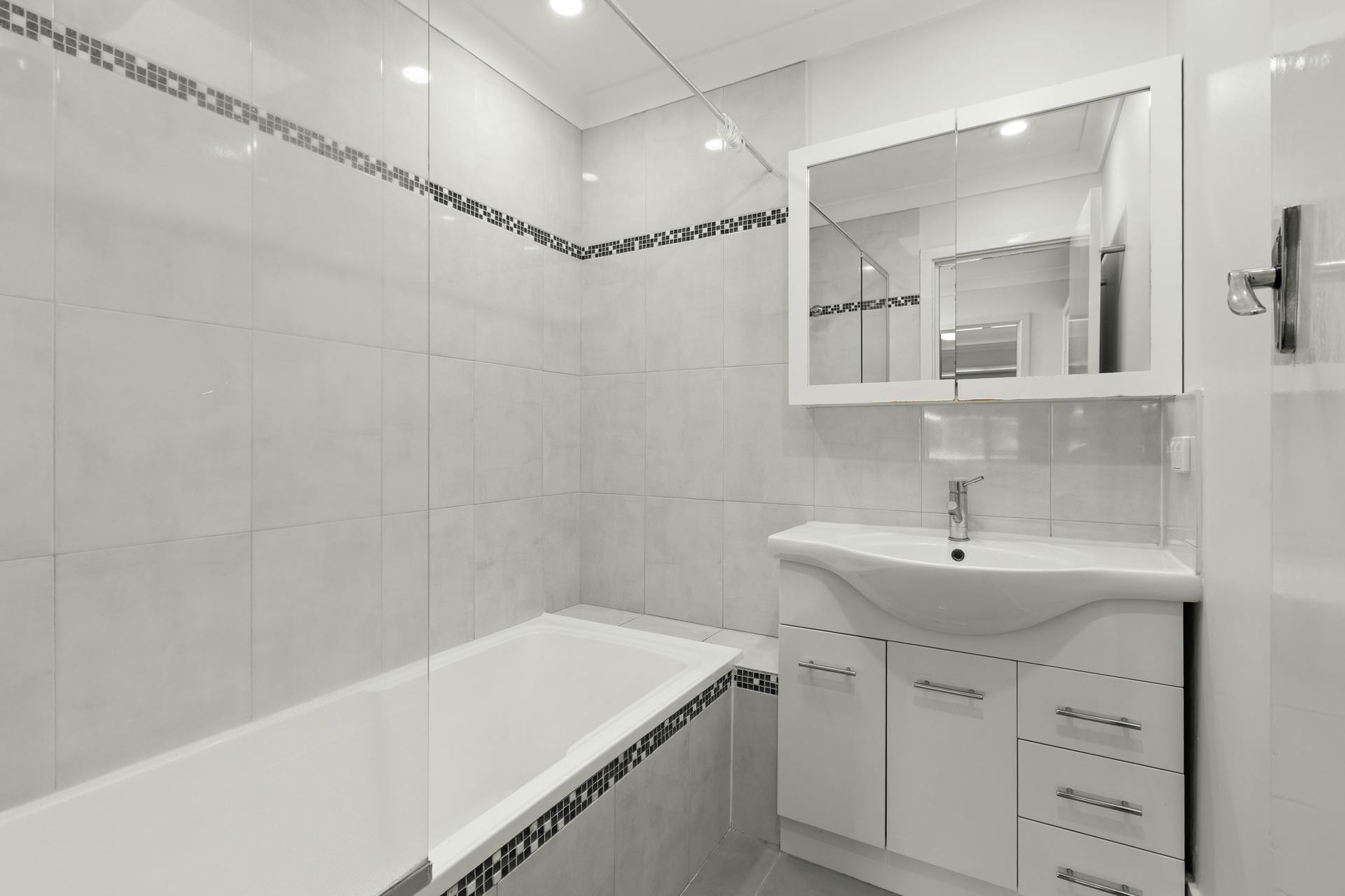 Just wait till you see the amazing bathroom, fully renovated as well in classic grey tiling, with a shower over bath, and fully tiled walls for ease of cleaning, with a new white vanity.