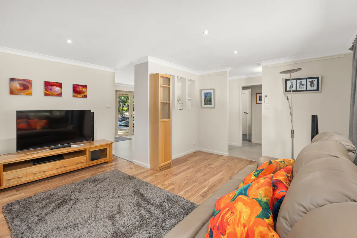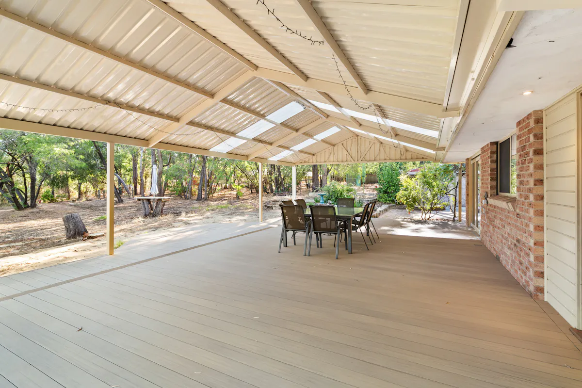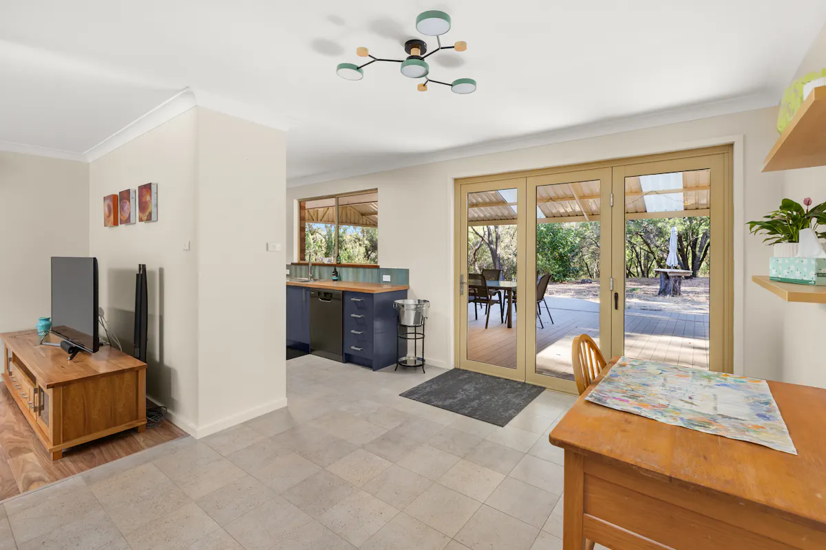 As you walk in the front door to the main part of the home, a spacious lounge room lies to the left, through to the meals area where stunning bifold doors open out to an enormous gabled patio, built specifically to fire ratings with a stunning deck, to sit and relax, or entertain with friends looking out over the tall trees.