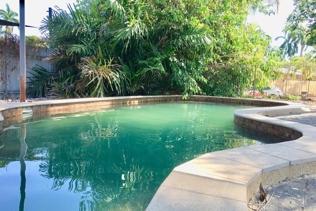 - Paved entertaining area surrounding the pool, covered with shade sail