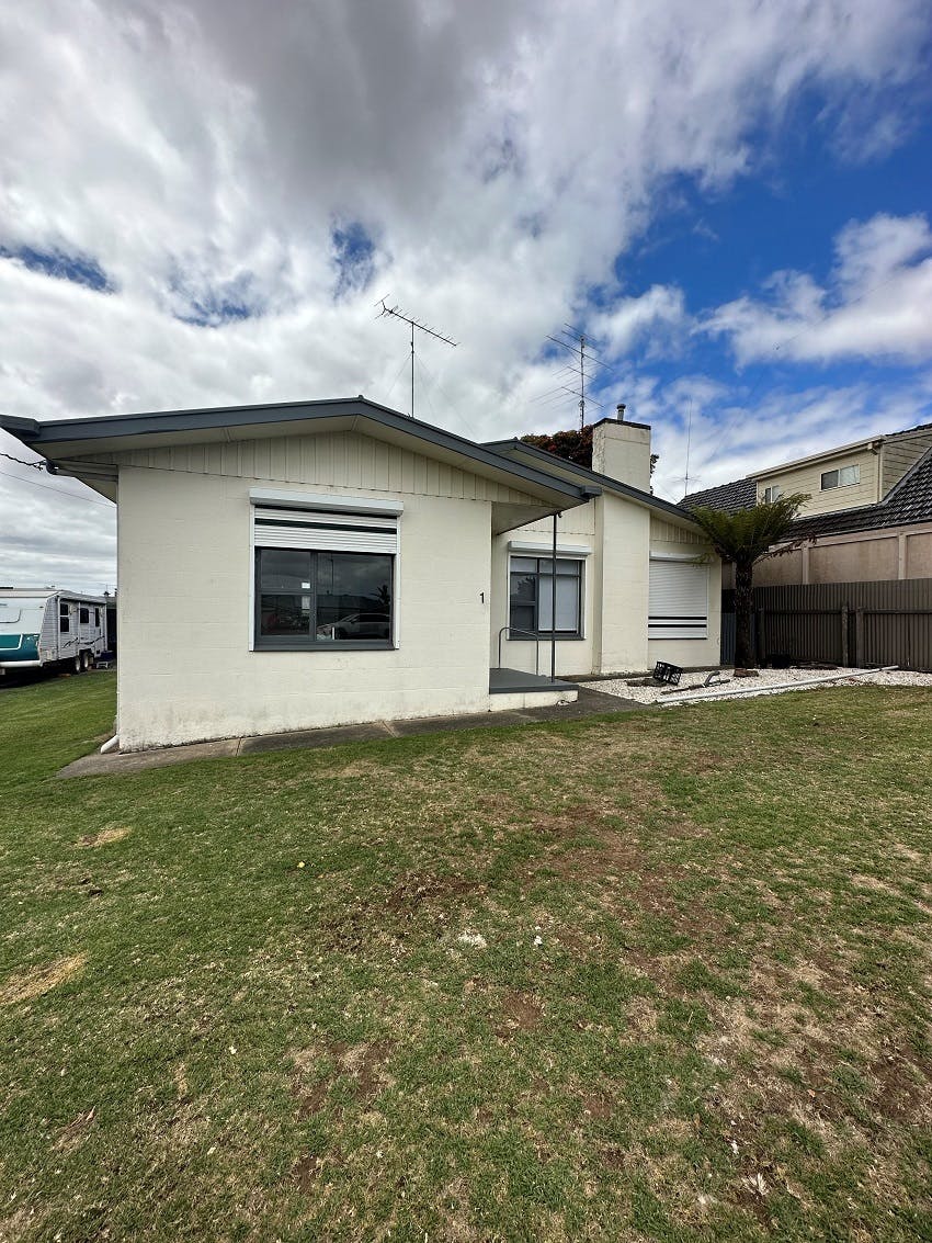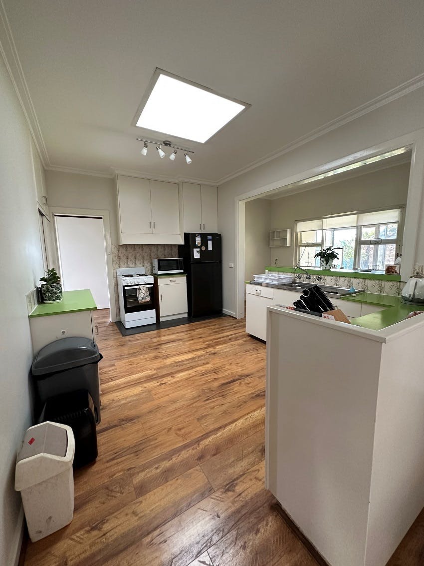 The open plan kitchen and dining area is well laid out, featuring electric cooking and a split system air conditioner to ensure year round comfort. The central bathroom includes a bath, shower and vanity, with a separate toilet for added convenience. An enclosed backroom extends the living area further, offering a versatile space that leads directly out to the backyard.