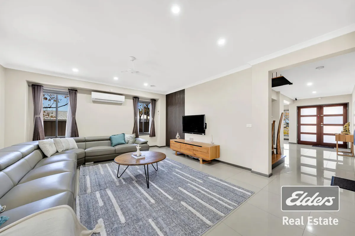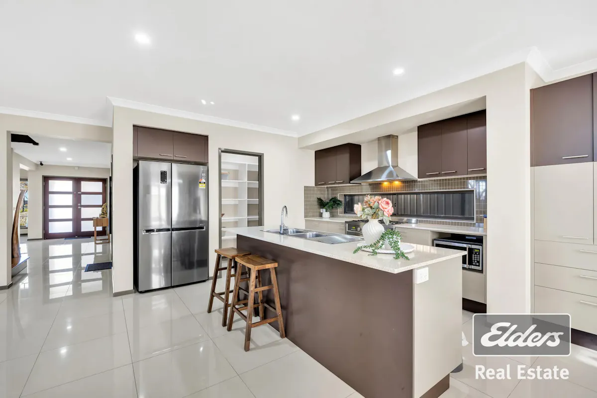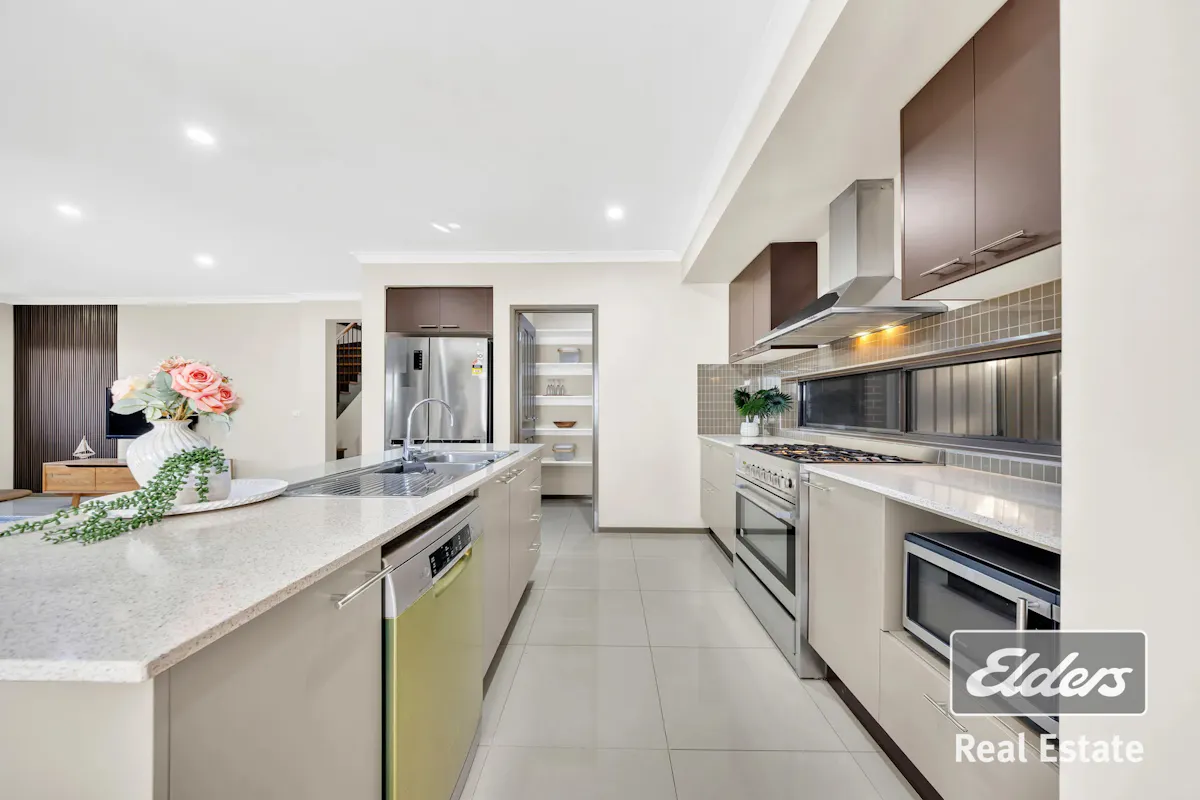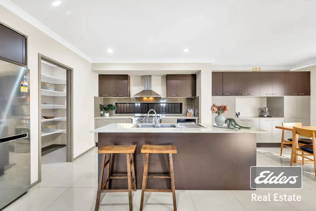 A grand double-door entry leads into a thoughtfully arranged floorplan with multiple living areas, giving families the flexibility to use the space in a way that suits their lifestyle. The kitchen is centrally located and designed for everyday functionality, featuring stone benchtops, a walk-in pantry, stainless steel appliances, and ample storage. It connects seamlessly with the dining and living areas, making it suitable for both daily living and entertaining. The downstairs living area also offers the option to be used as a guest bedroom if required.