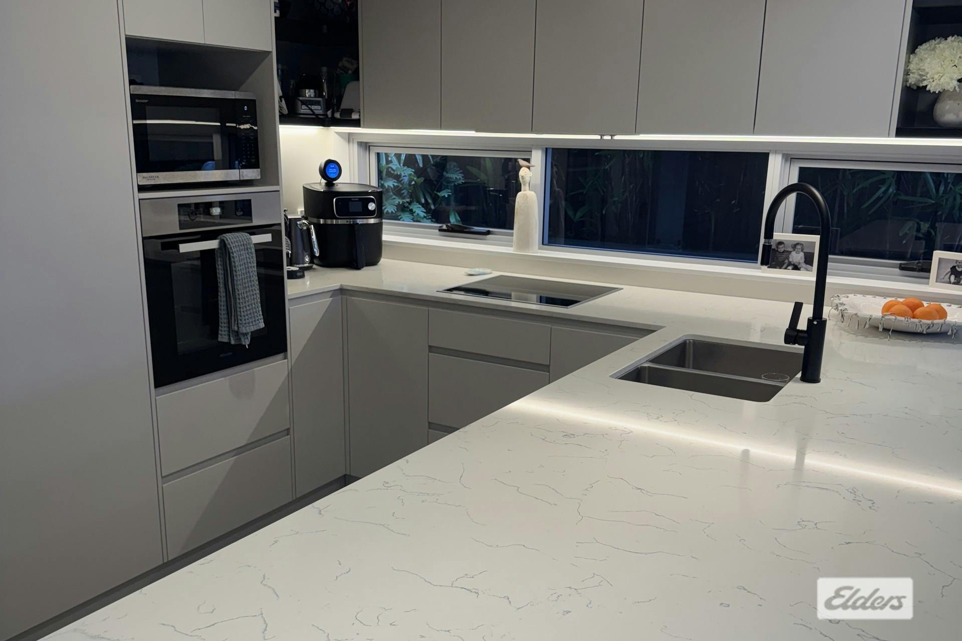 Gourmet Kitchen: A chef's dream with stone waterfall benchtops, integrated appliances, and premium fixtures – perfect for preparing meals with ease.