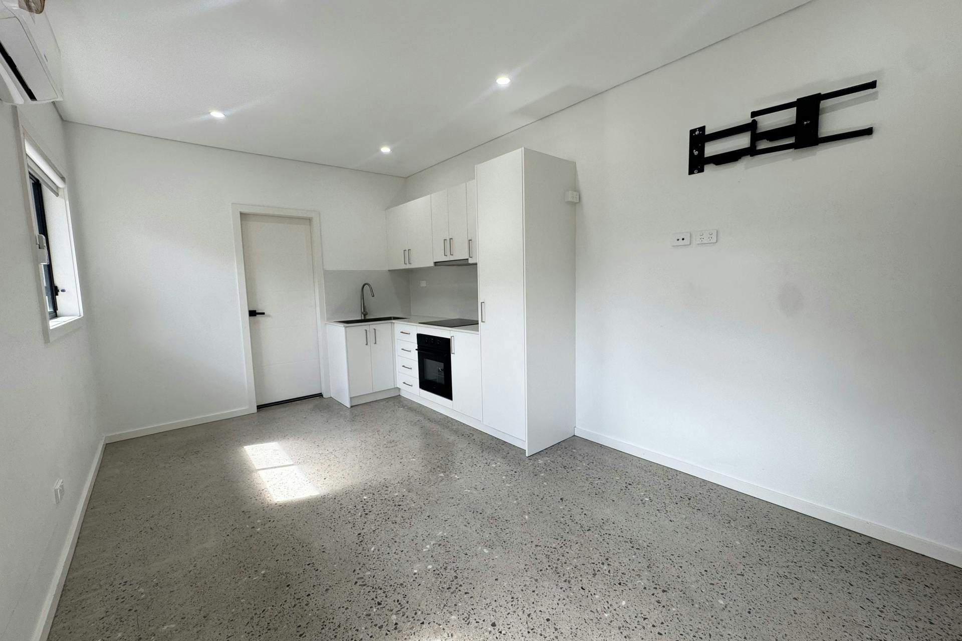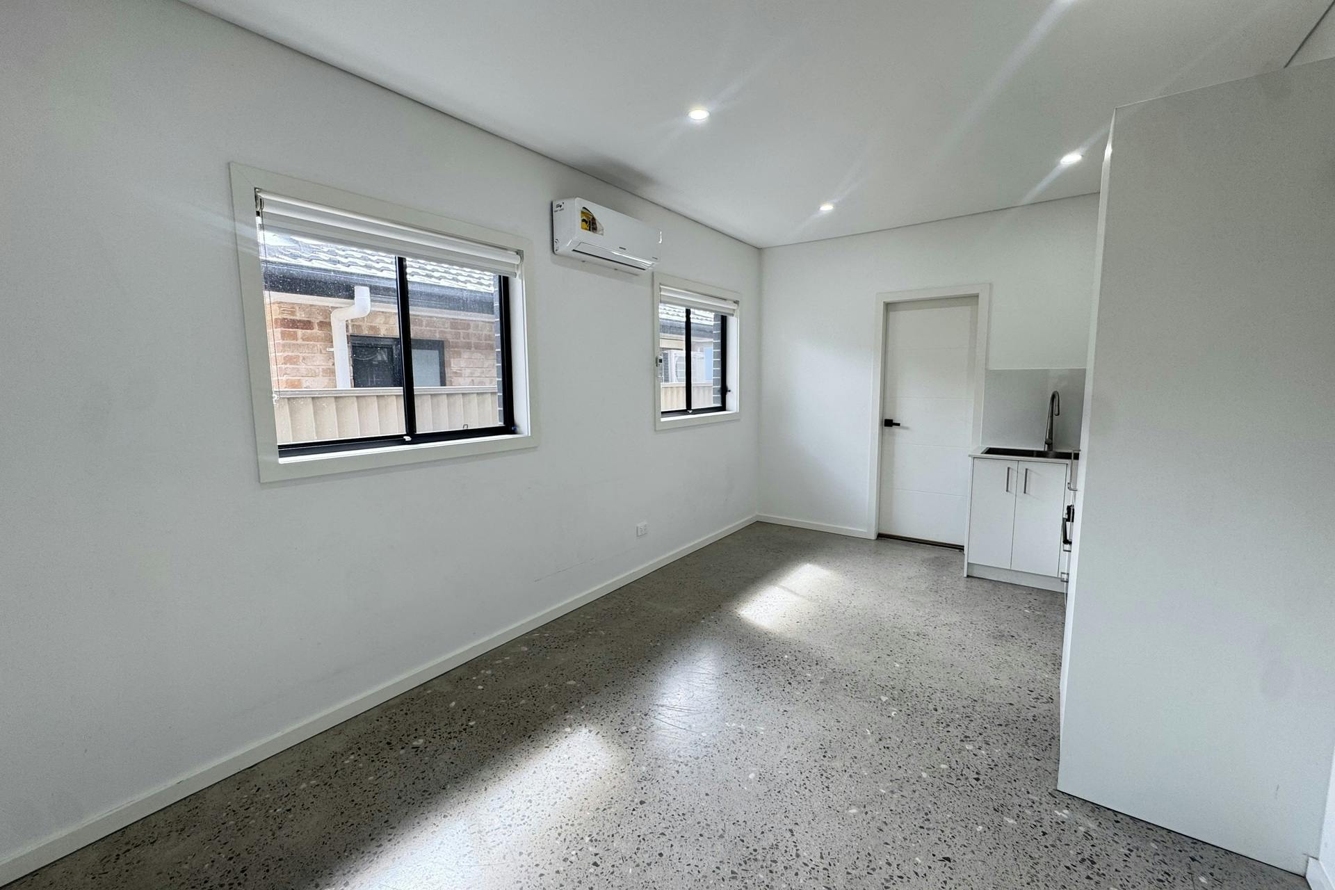 - Open-plan layout with sleek polished concrete flooring