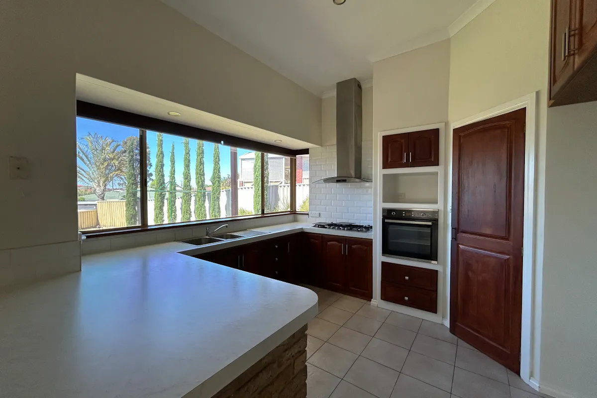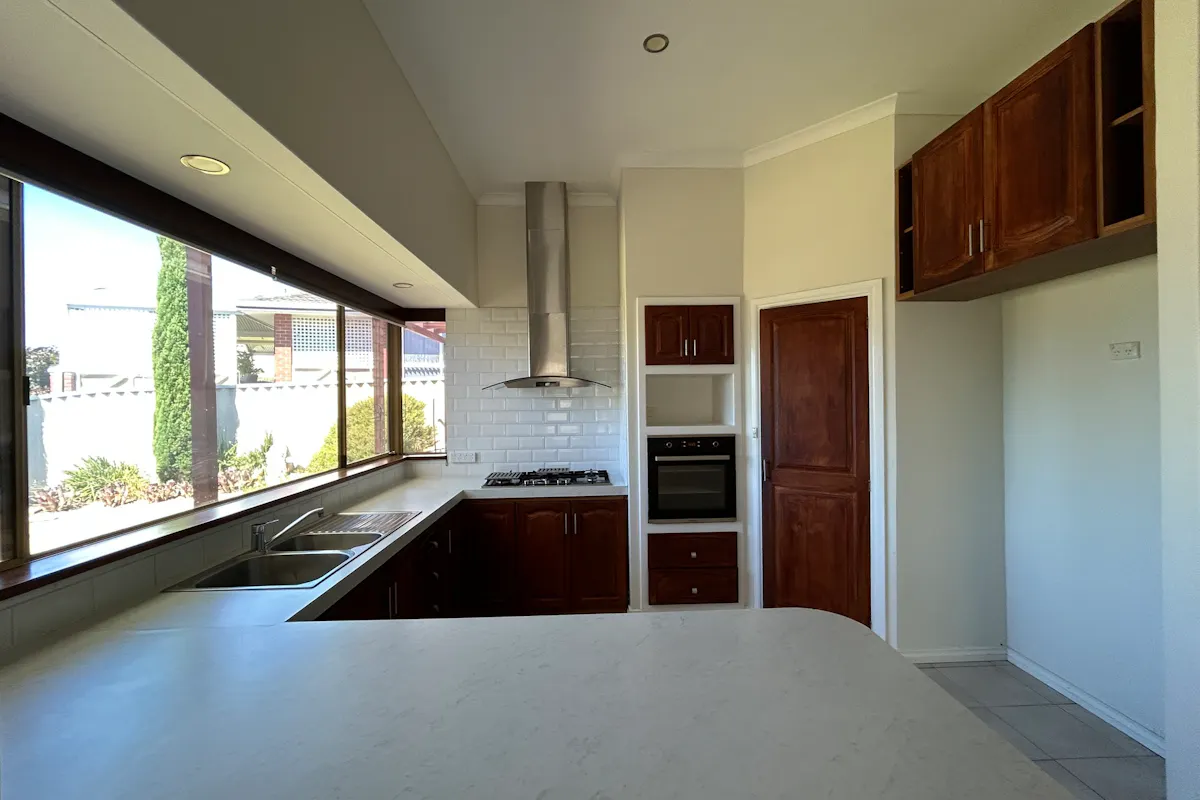 - Kitchen with Jarrah cupboards and stainless steel appliances