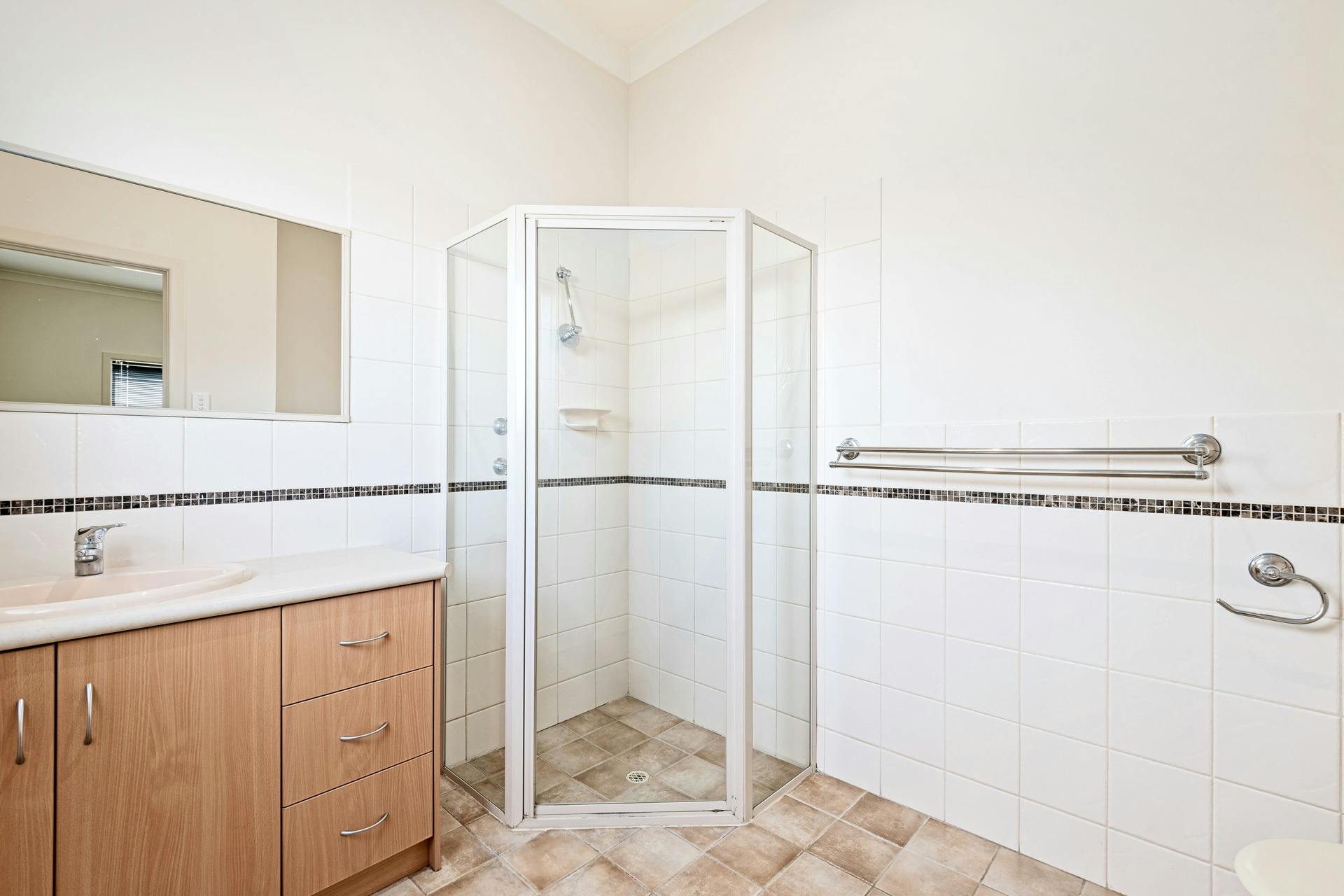 - The spacious master bedroom offers a large walk-in robe and an ensuite bathroom with a shower, toilet, and a vanity unit with storage. The remaining two bedrooms are spacious, with one featuring built-in robes.