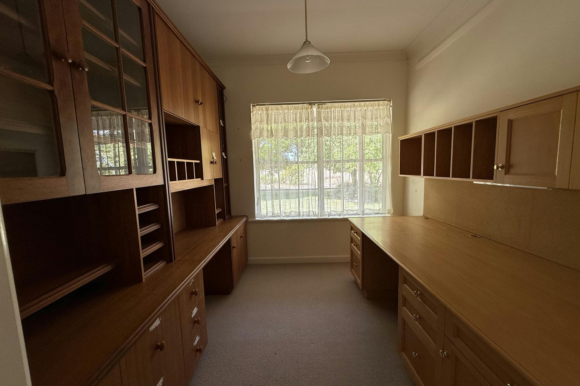 Office space with lots of built in storage and desk.