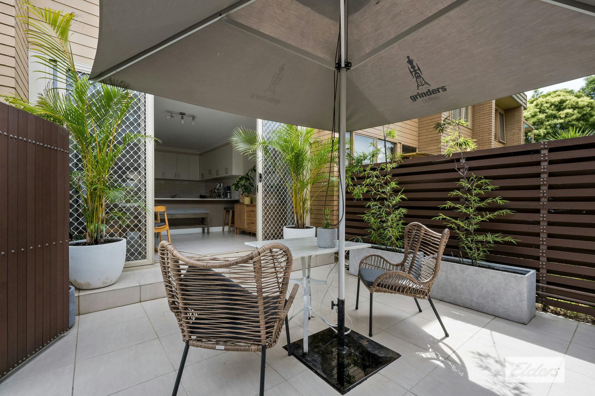 Double sliding doors extend the living space outdoors to a paved courtyard, offering a private and peaceful setting for alfresco dining or unwinding. Residents also enjoy access to a shared communal area complete with a BBQ, reinforcing the relaxed, community-oriented feel of the complex.