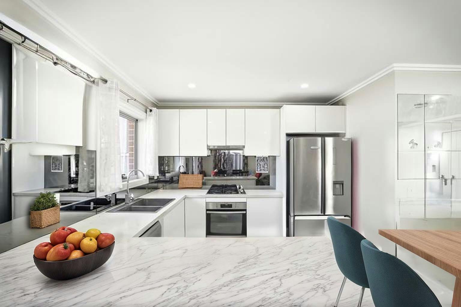 - Large modern kitchen featuring a luxurious 40mm stone benchtop, mirrored splashback, gas cooking, and quality finishes
