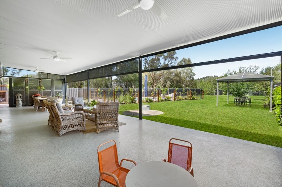 • Rear patio (15 × 5 m) with fans and outdoor blinds