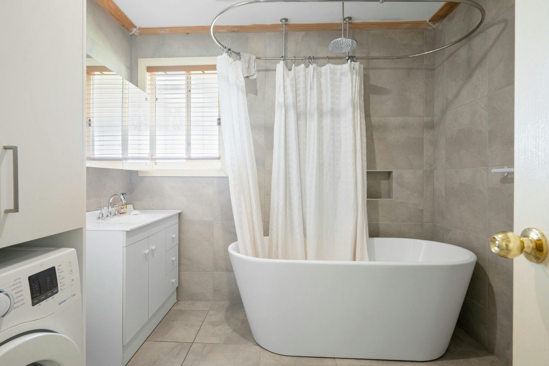 • Modern combined bathroom/laundry with shower-over-bath, vanity and toilet.