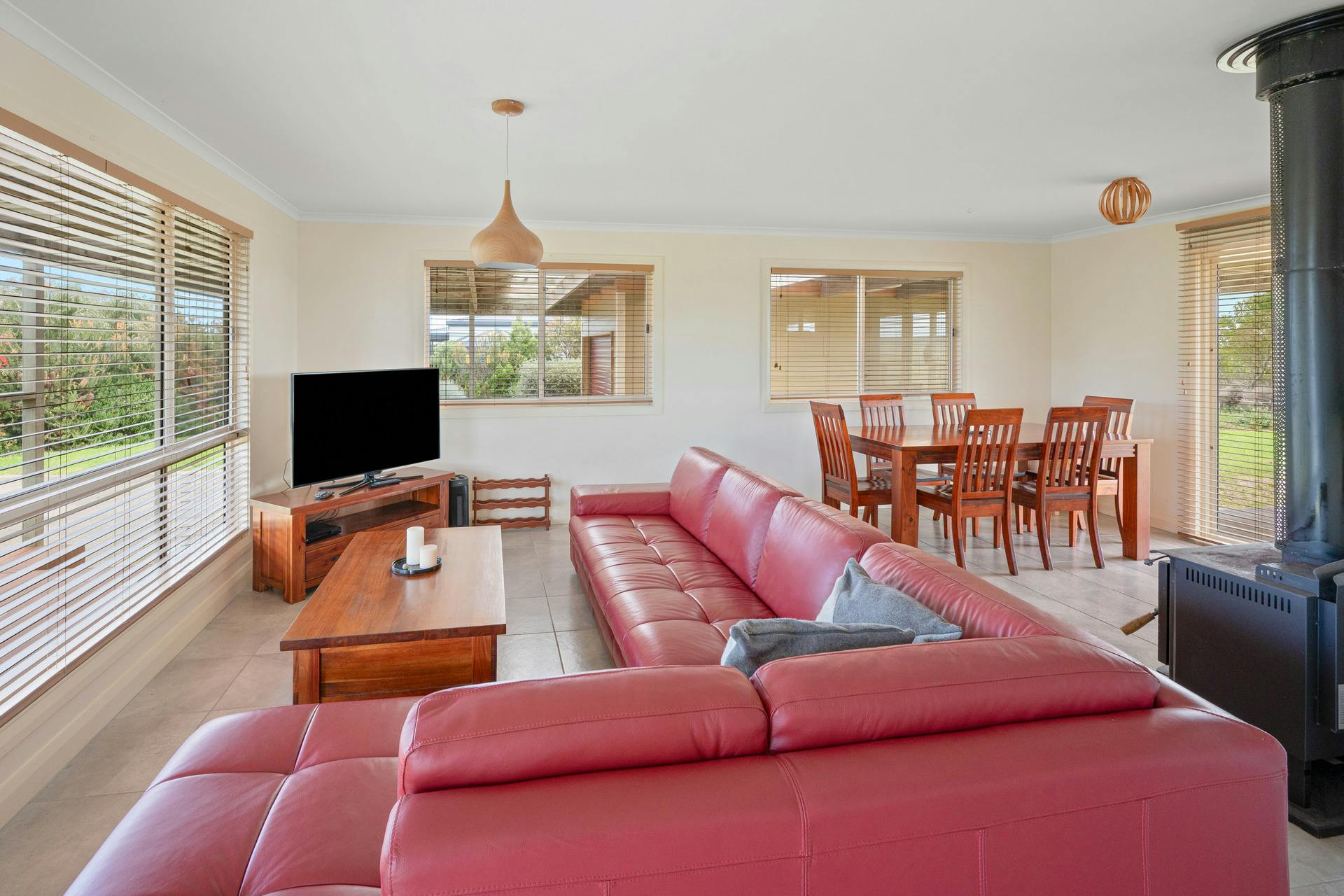 • Easy care open-plan living area with tiled floors and a cosy slow-combustion wood heater.