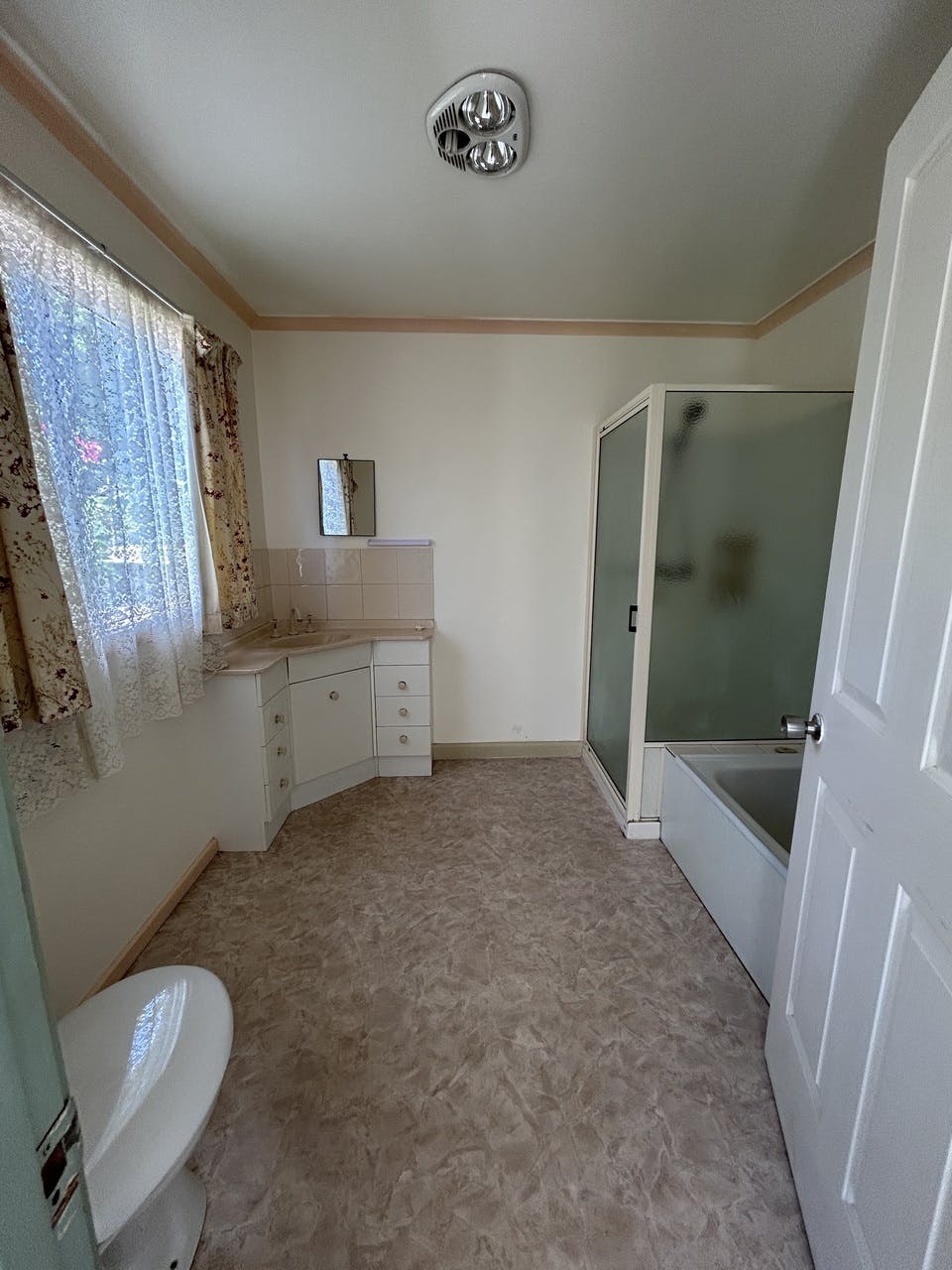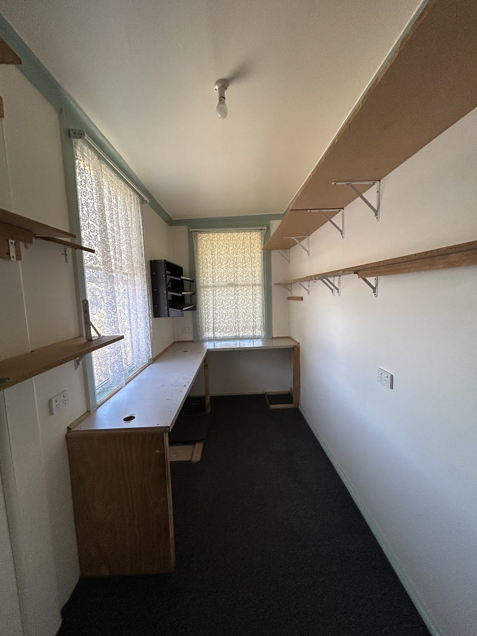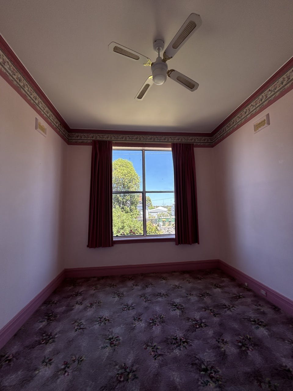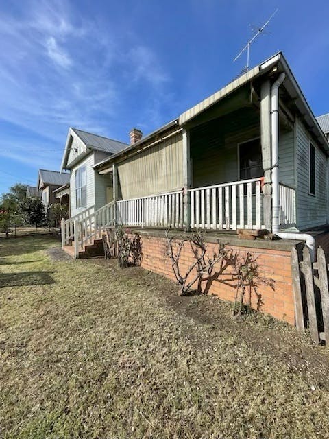 The home with three large bedrooms off a central hallway, a lounge with gas log fire, leading to an enclosed veranda section currently used as an office, a roomy kitchen with gas cooking, dishwasher, and large pantry cupboard, a rear porch/laundry, and a modern bathroom with a bath, a shower, and a corner vanity basin.An elevated veranda at the front overlooks a small front yard with a picket fence while at the rear is a secure yard with a 3 bay steel framed shed and an older original garage.