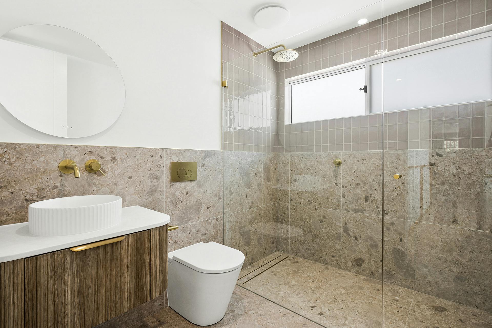 - Stone kitchen with gas cooking, ample bench space and storage, finished with elegant gold tapware