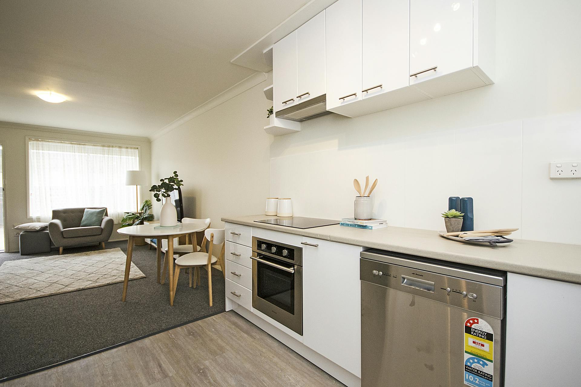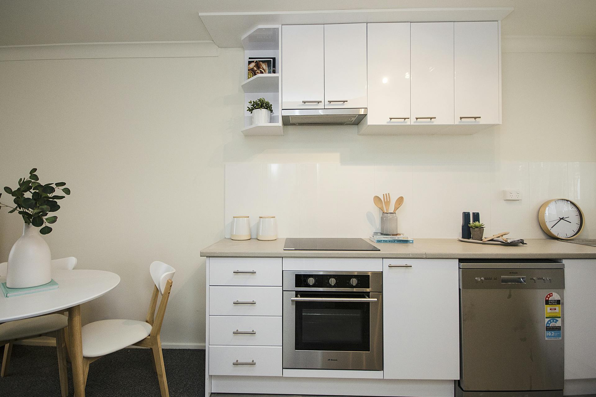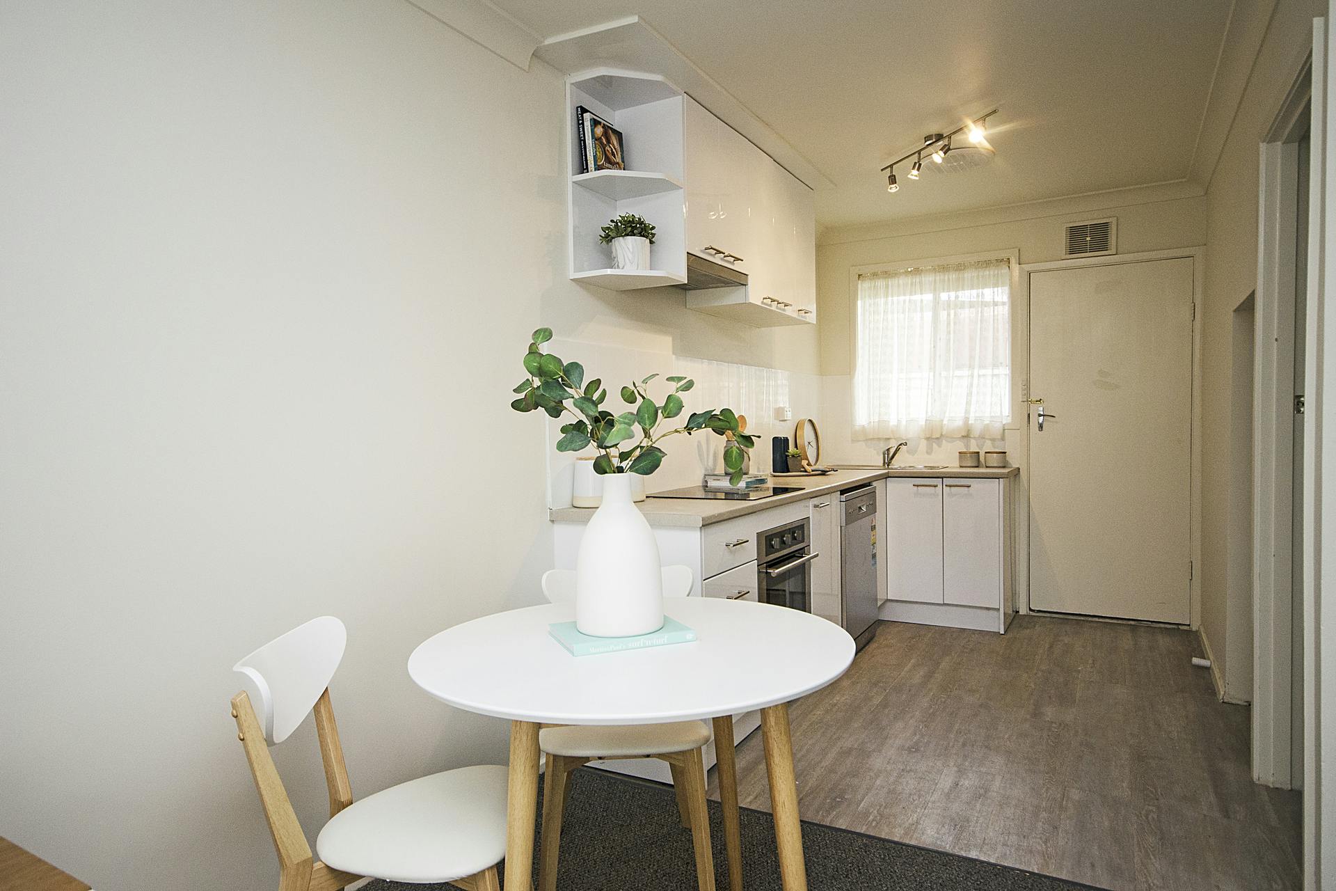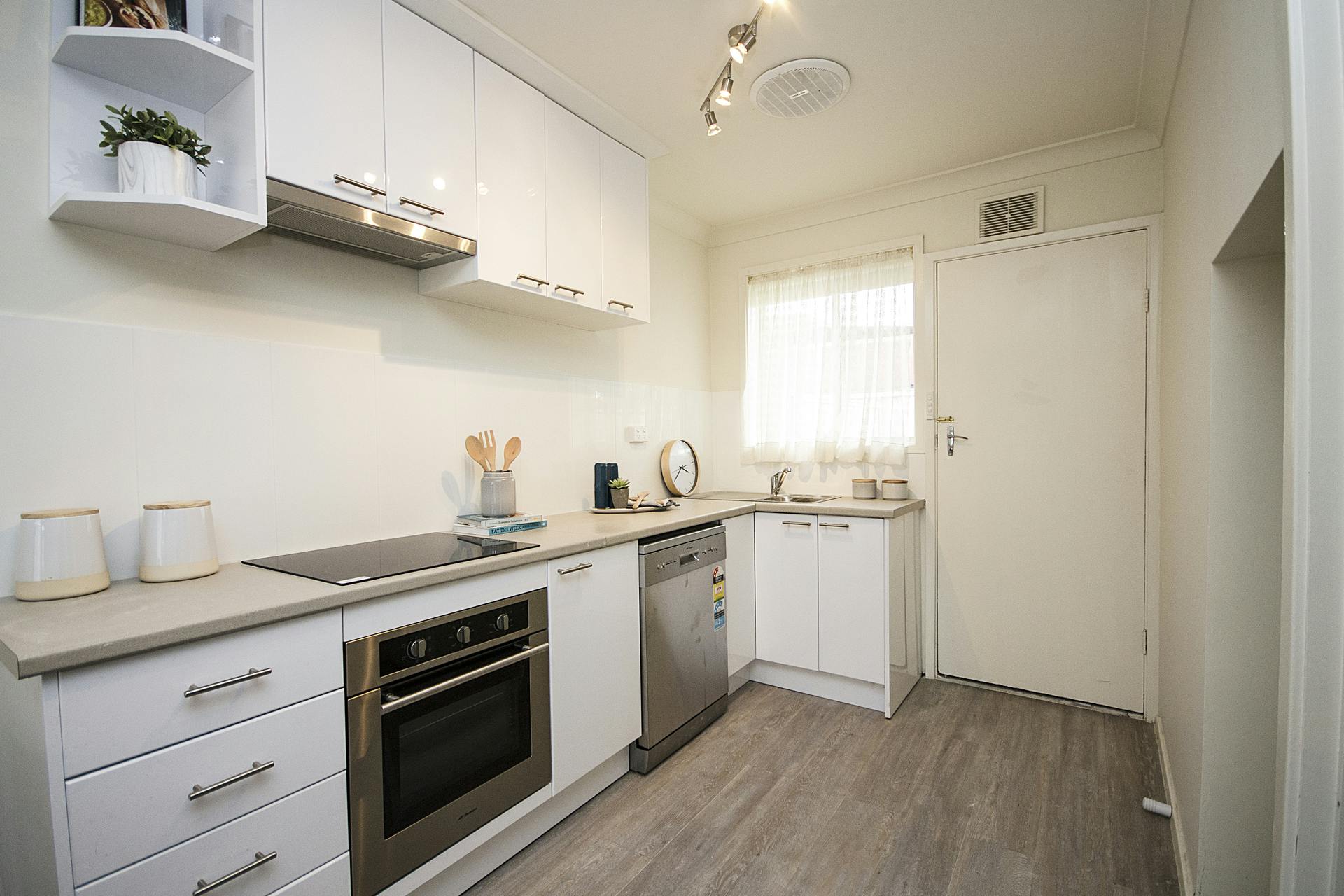 - Kitchen with a 2pac finish and updated stainless steel cooking, which sits adjacent to the meals/lounge room