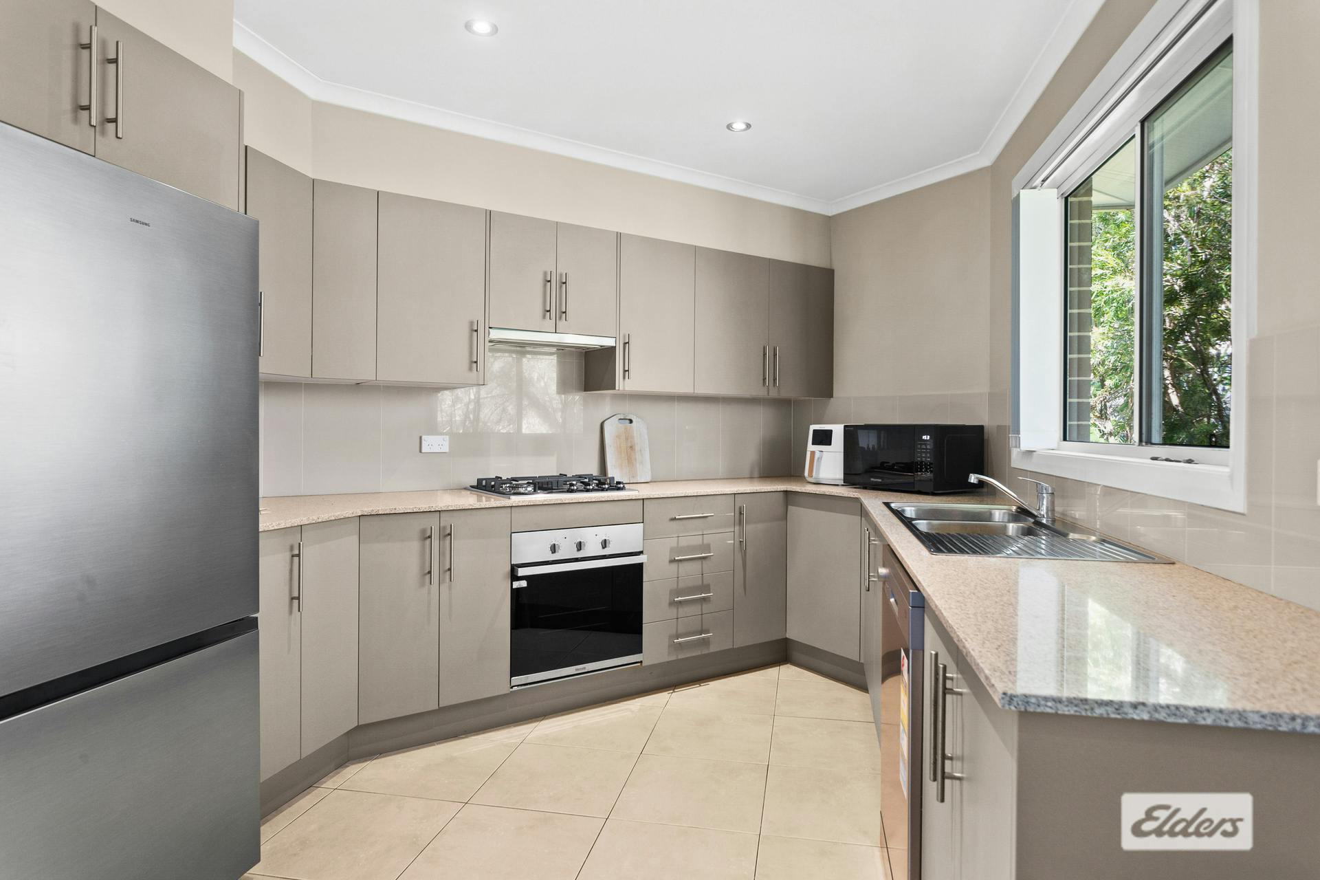 - Kitchen with stone benchtops, gas cooking & stainless appliances