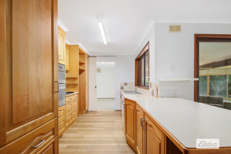 The well-appointed kitchen features ample storage, a gas cooktop, and a dishwasher, flowing seamlessly into the dining area. From here, enjoy views over the back sunroom – or utilise this versatile space as a second lounge room – overlooking landscaped gardens, lush green lawns, and established shade trees.
