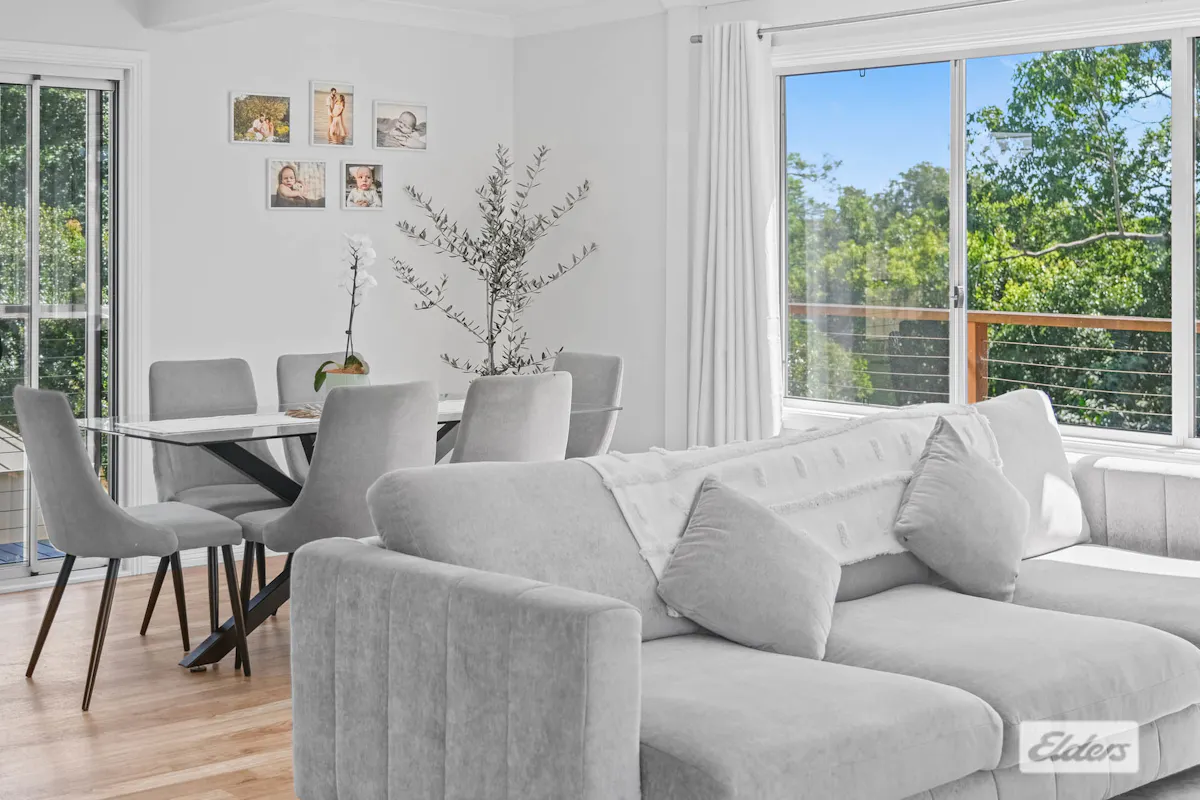 Light-filled open plan lounge and dining area with modern flooring and window furnishings