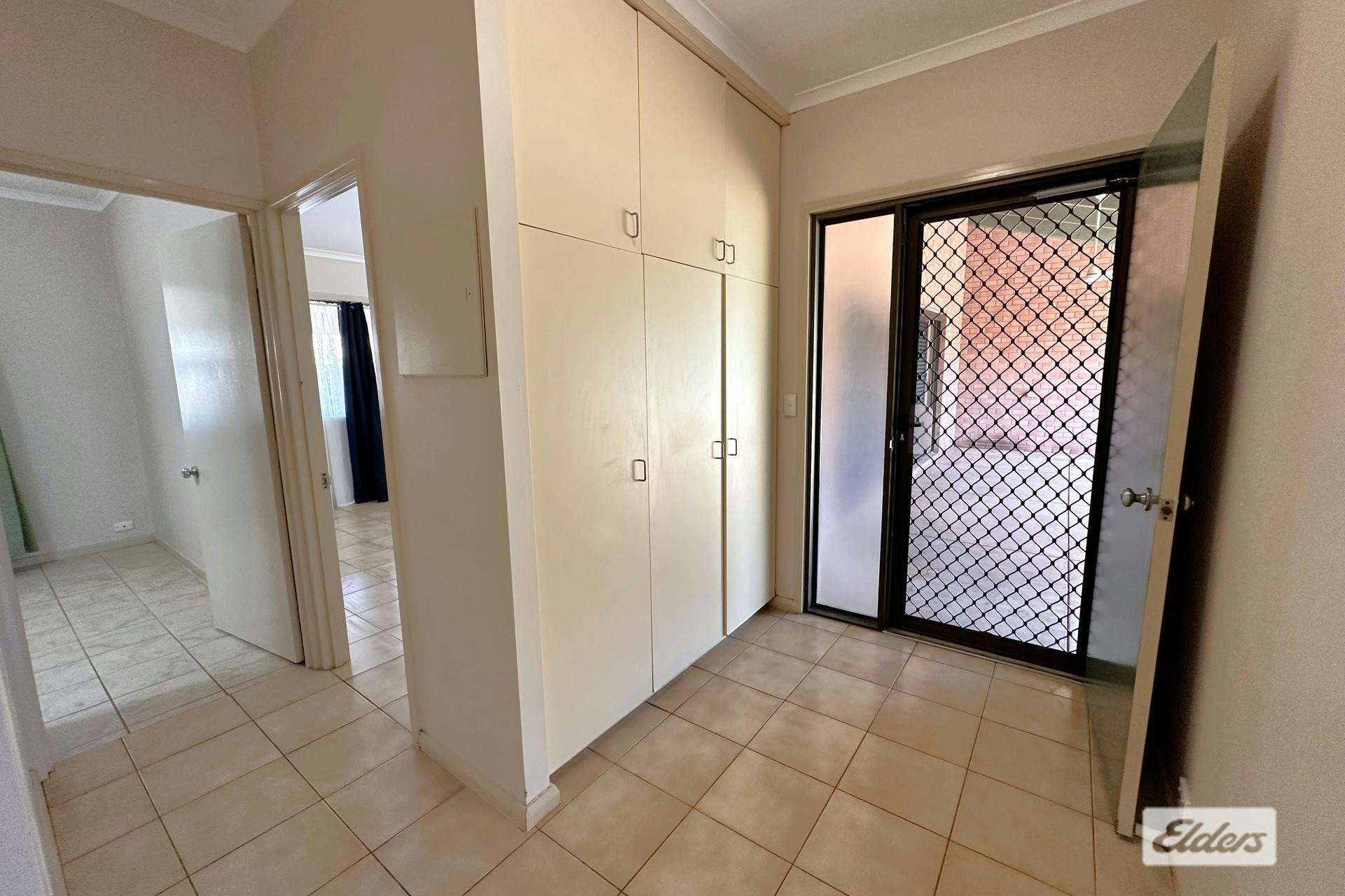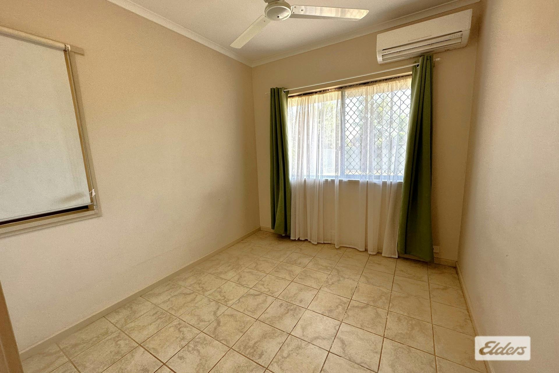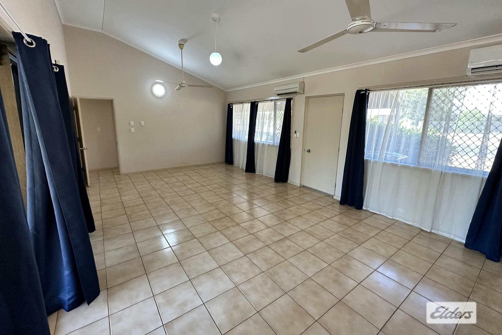 This solid and secure ground-level home is getting ready for its next tenants!- Living: Spacious lounge room with high ceilings, tiled flooring, split system air conditioning, and sliding doors opening to a large undercover entertaining area.