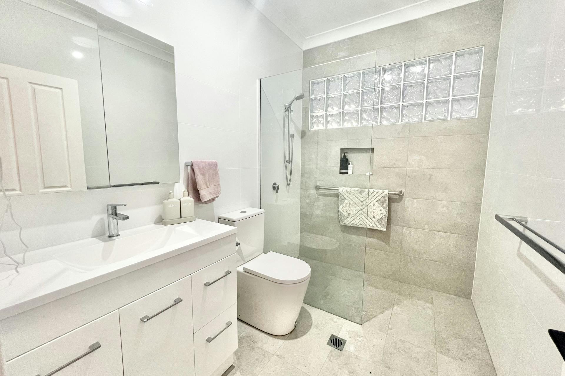 * Renovated bathroom with large shower area