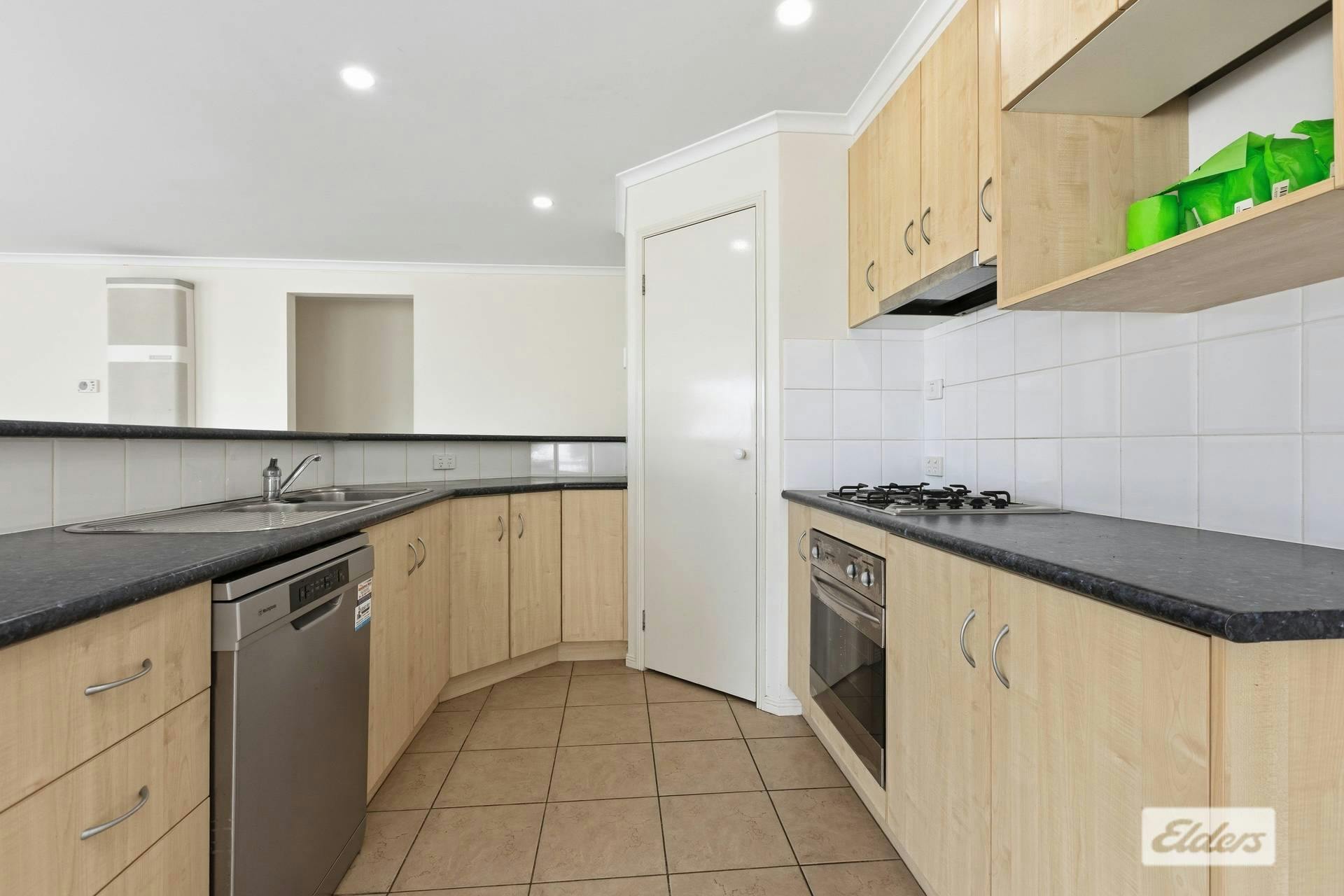 A neat and functional kitchen features a gas cooktop, rangehood, dishwasher, pantry and great cabinetry.