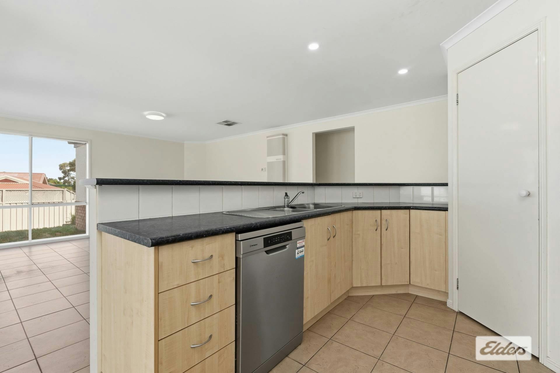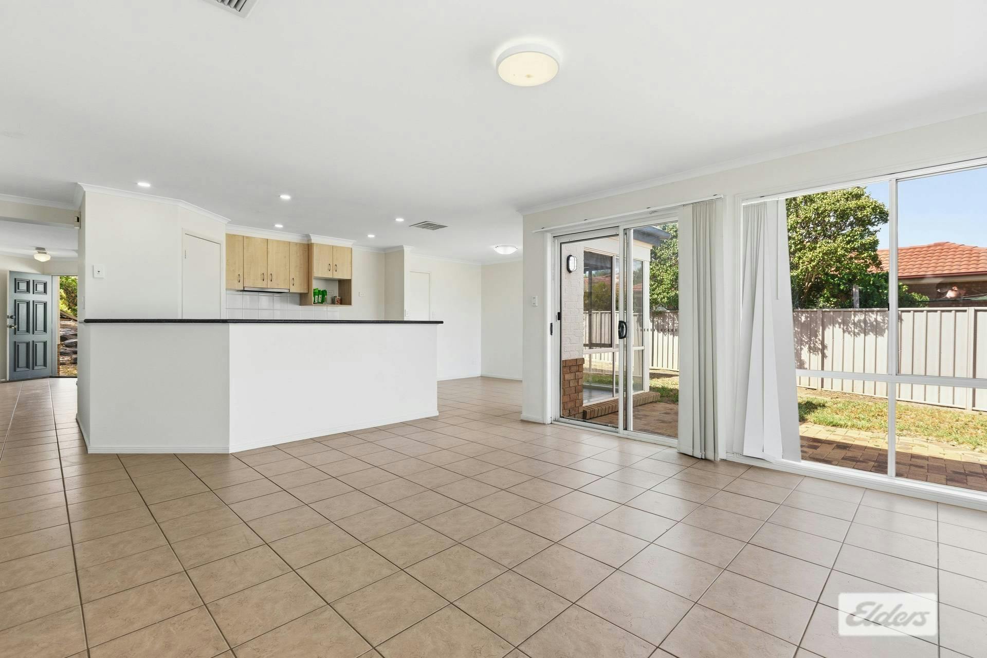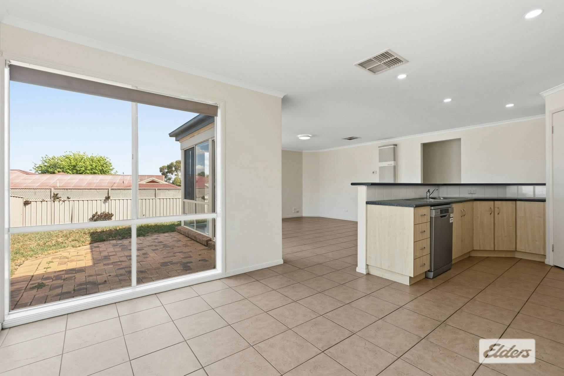 The lounge room is prime for entertainment, also featuring curtains, evaporative cooling, gas heating and carpet. This area flows seamlessly into the tiled kitchen |dining | living zone.
