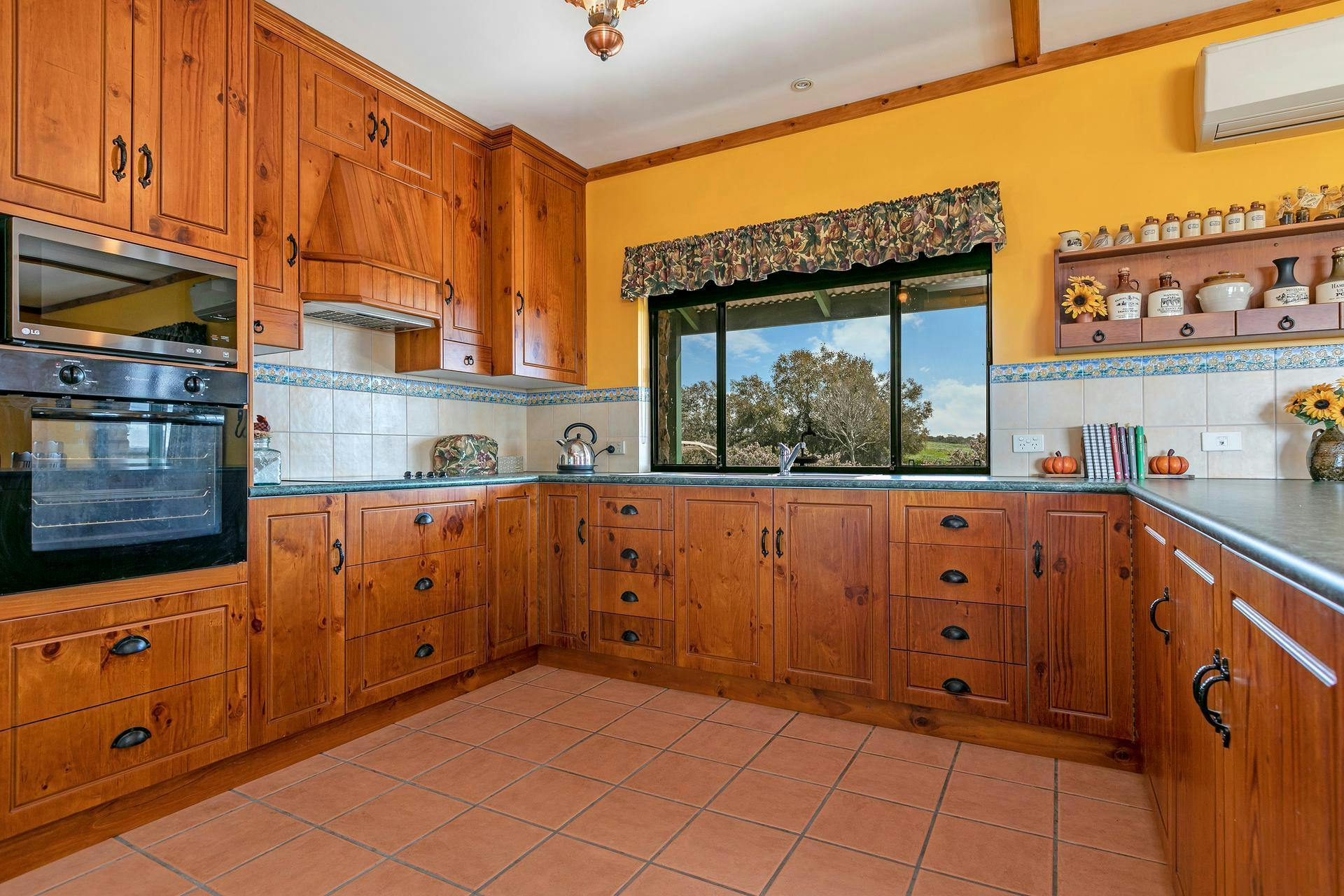 Built in 2010, the property features impressive cathedral ceilings, stunning exposed timber beams, and a generous open-plan layout combining the kitchen, dining, and living areas. The spacious timber kitchen offers excellent storage with ample cupboards and bench space, along with a halogen cooktop, bench oven, built-in microwave, large pantry, and double fridge cavity - perfect for modern living.