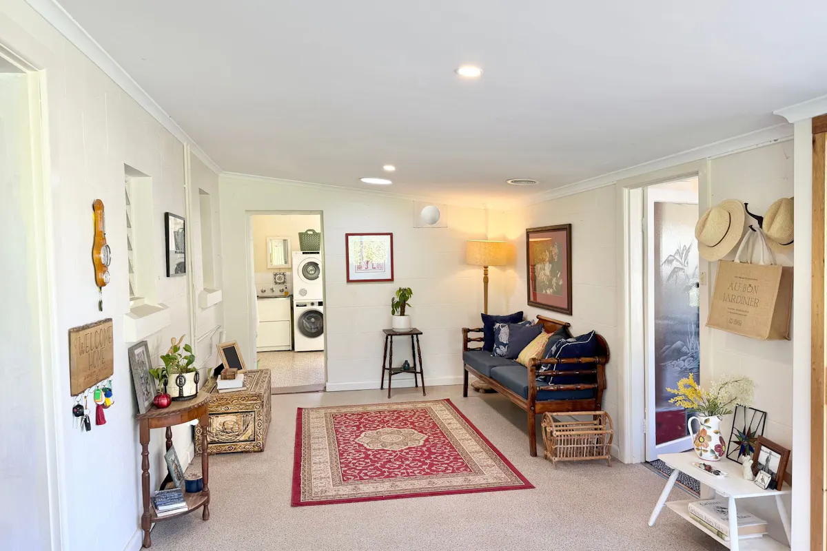 Light-filled living with high ceilings and timber floors