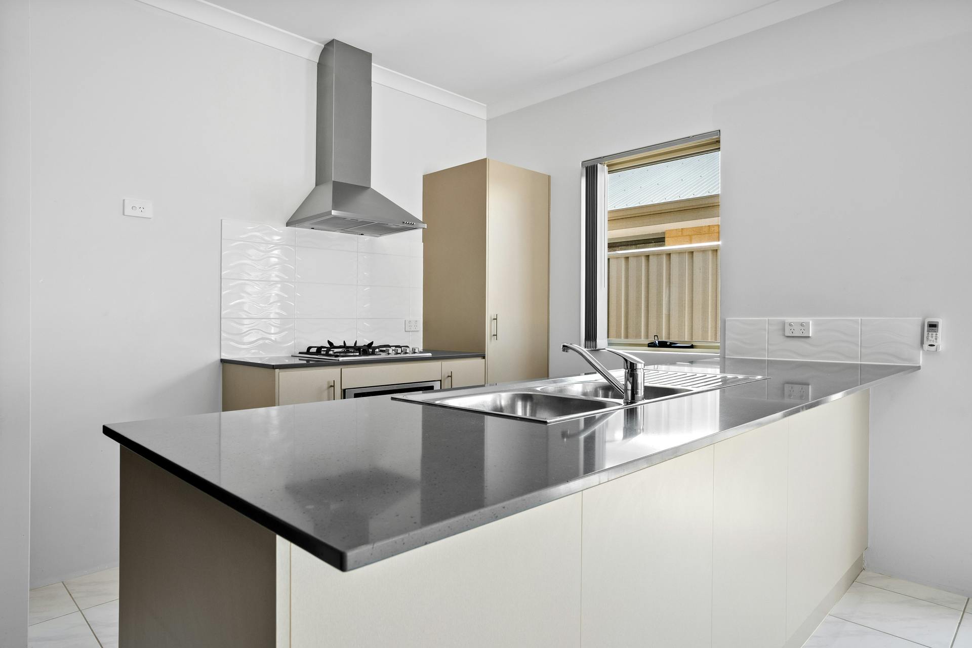 Contemporary kitchen with stainless steel appliances, stone benchtops & ample storage