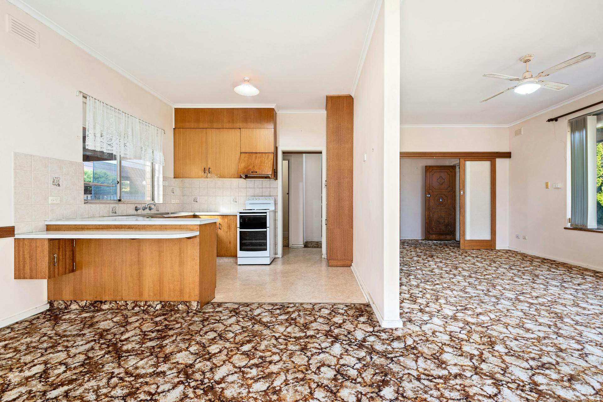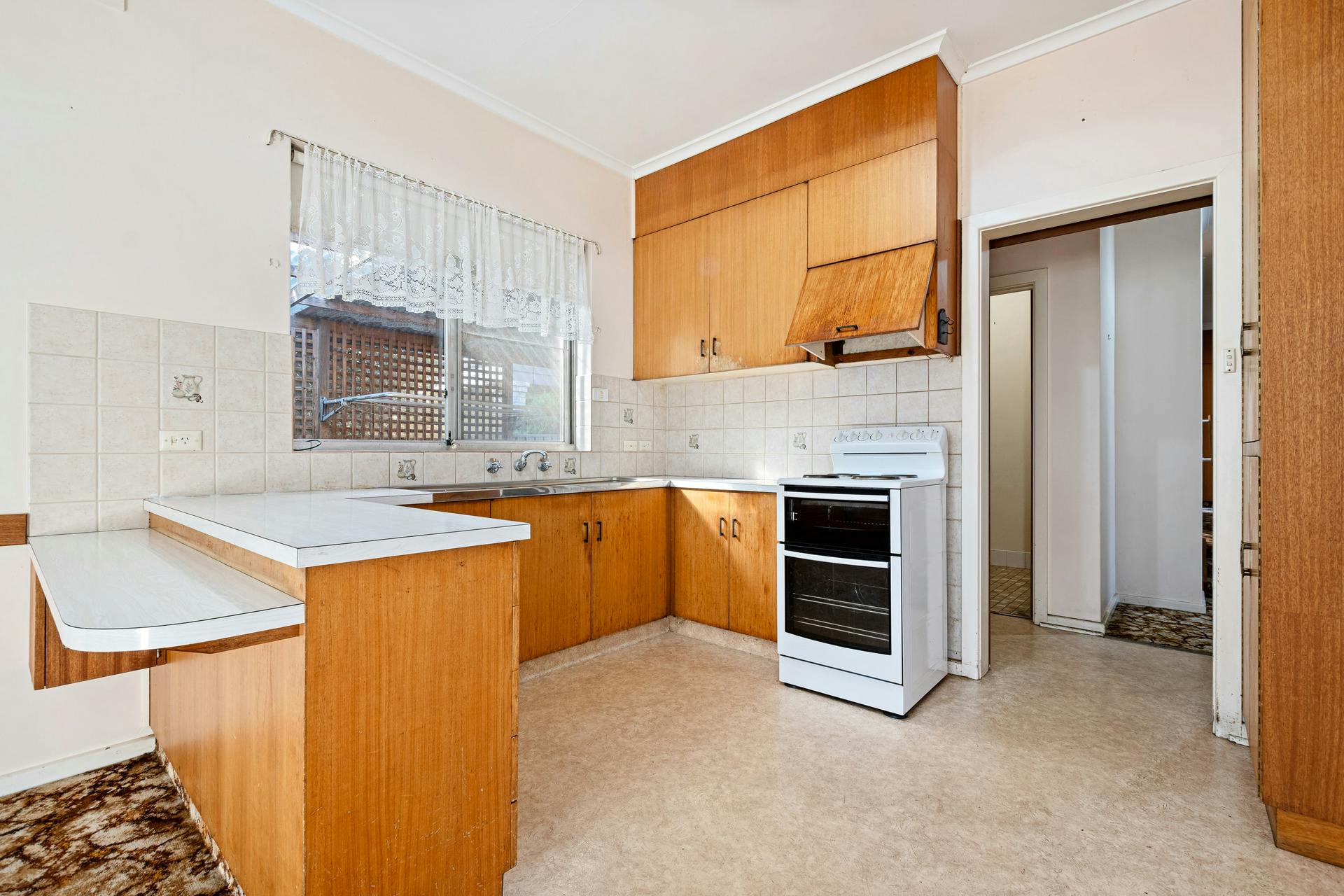 - Kitchen with freestanding electric oven and cooktop, ample bench space and generous storage