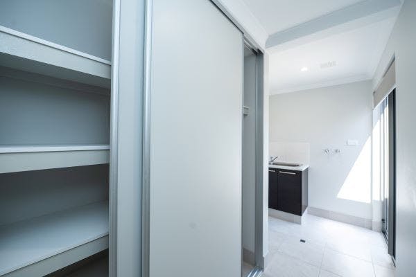 - Separate laundry with shelving and broom storage
