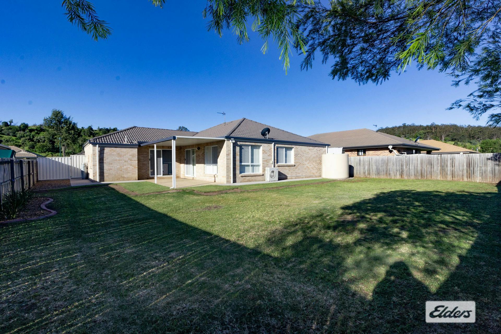 Fully fenced rear yard with water tank.