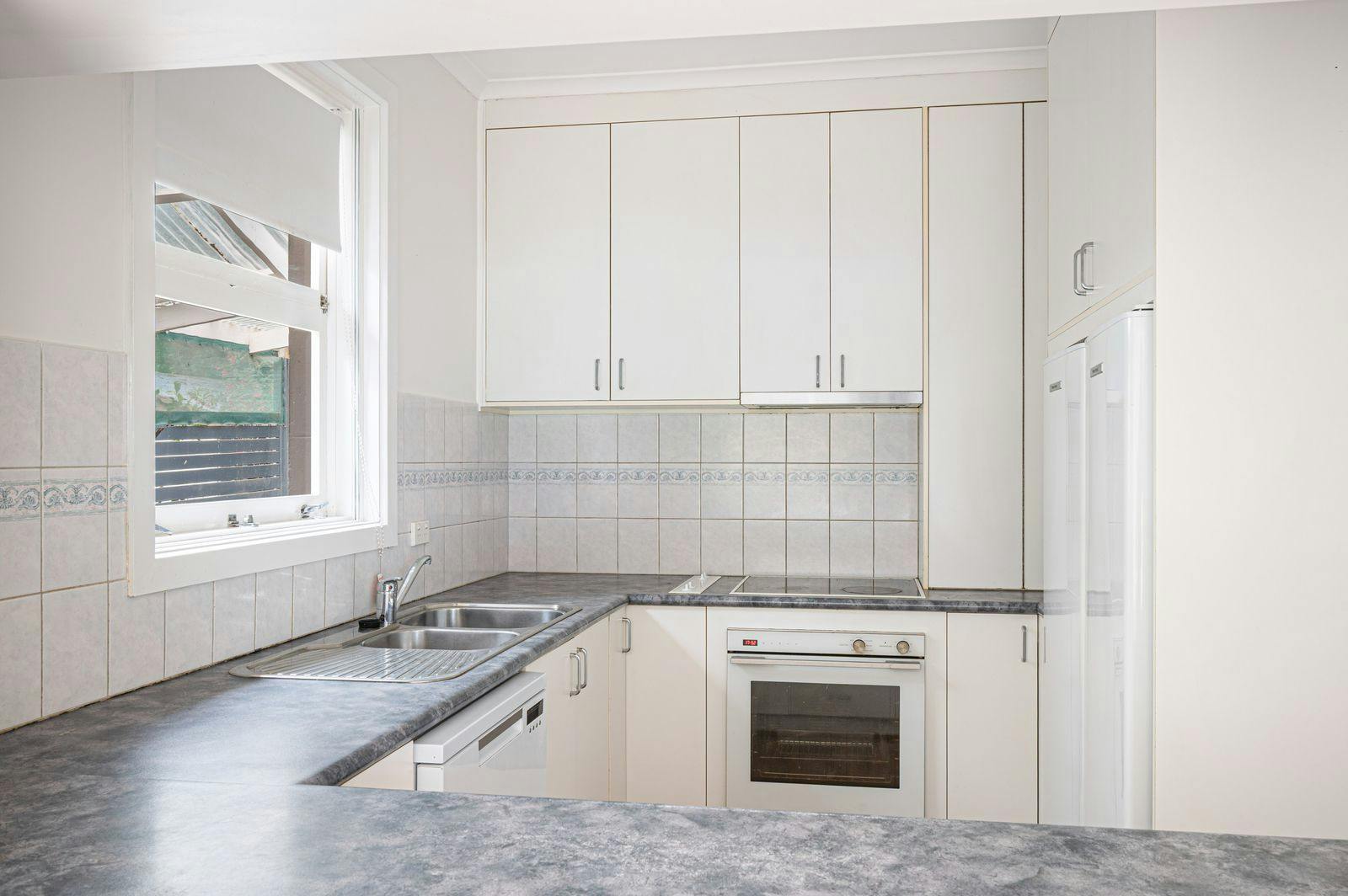 Separate kitchen with ample storage, double sink, dishwasher, and electric cooking.