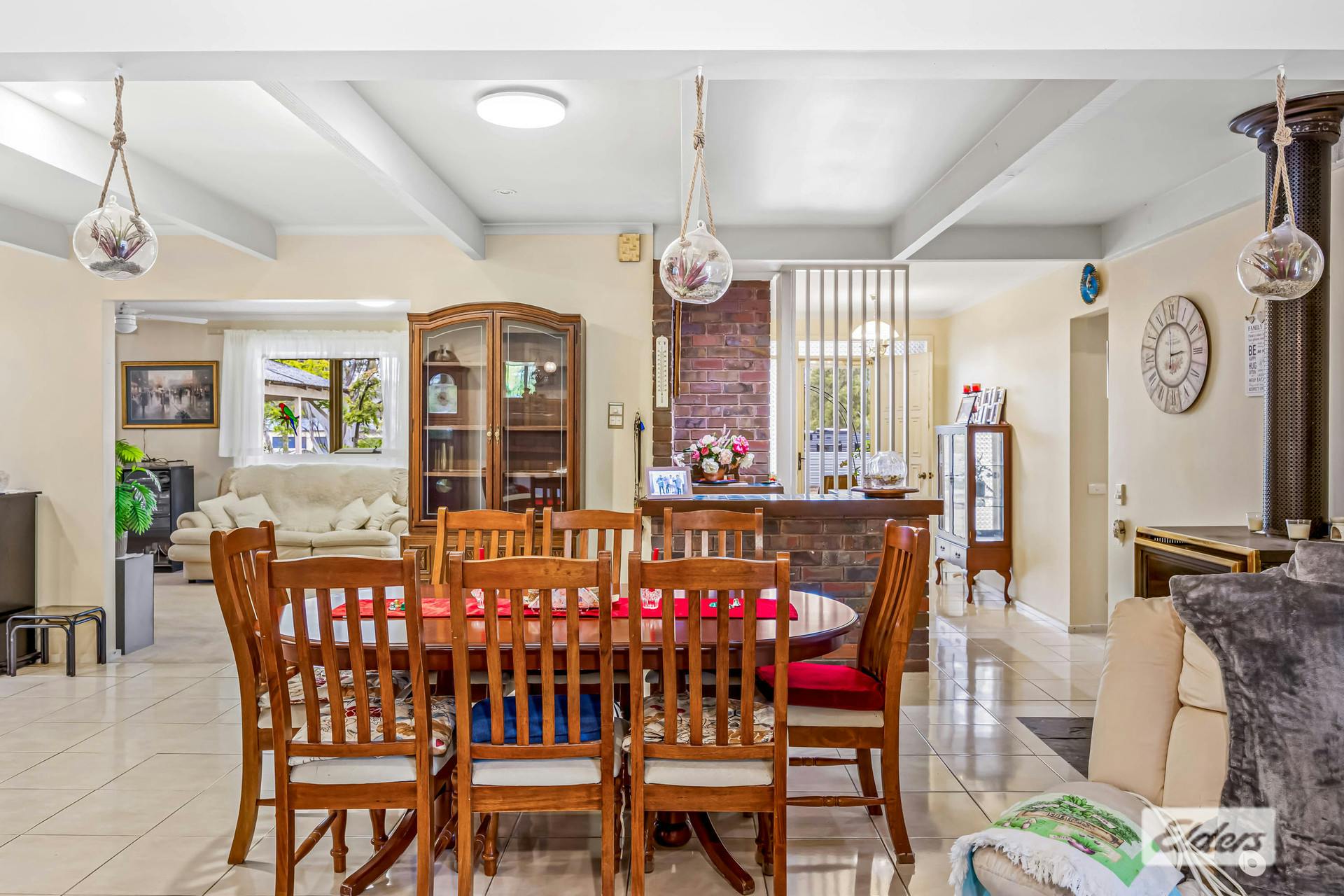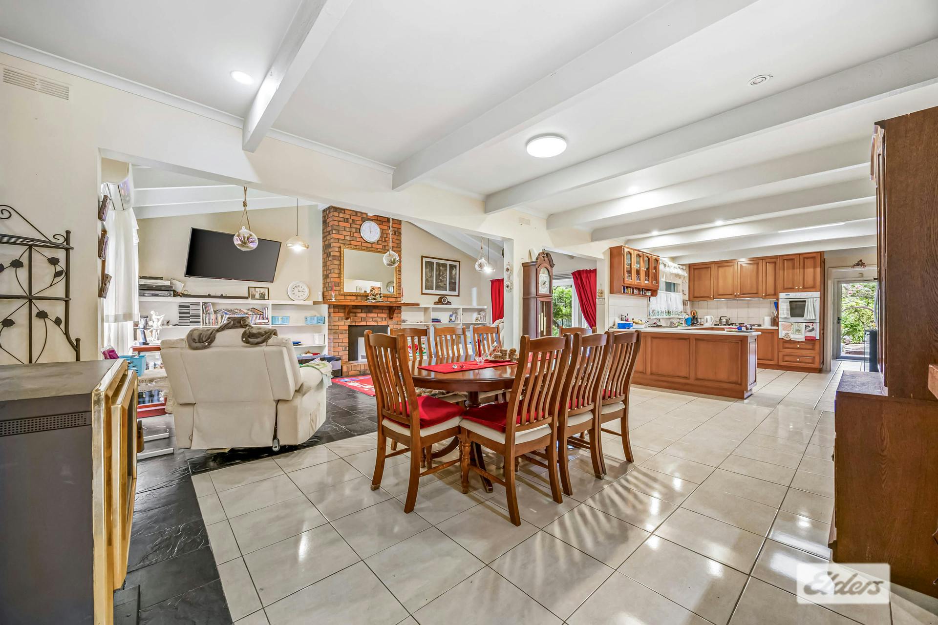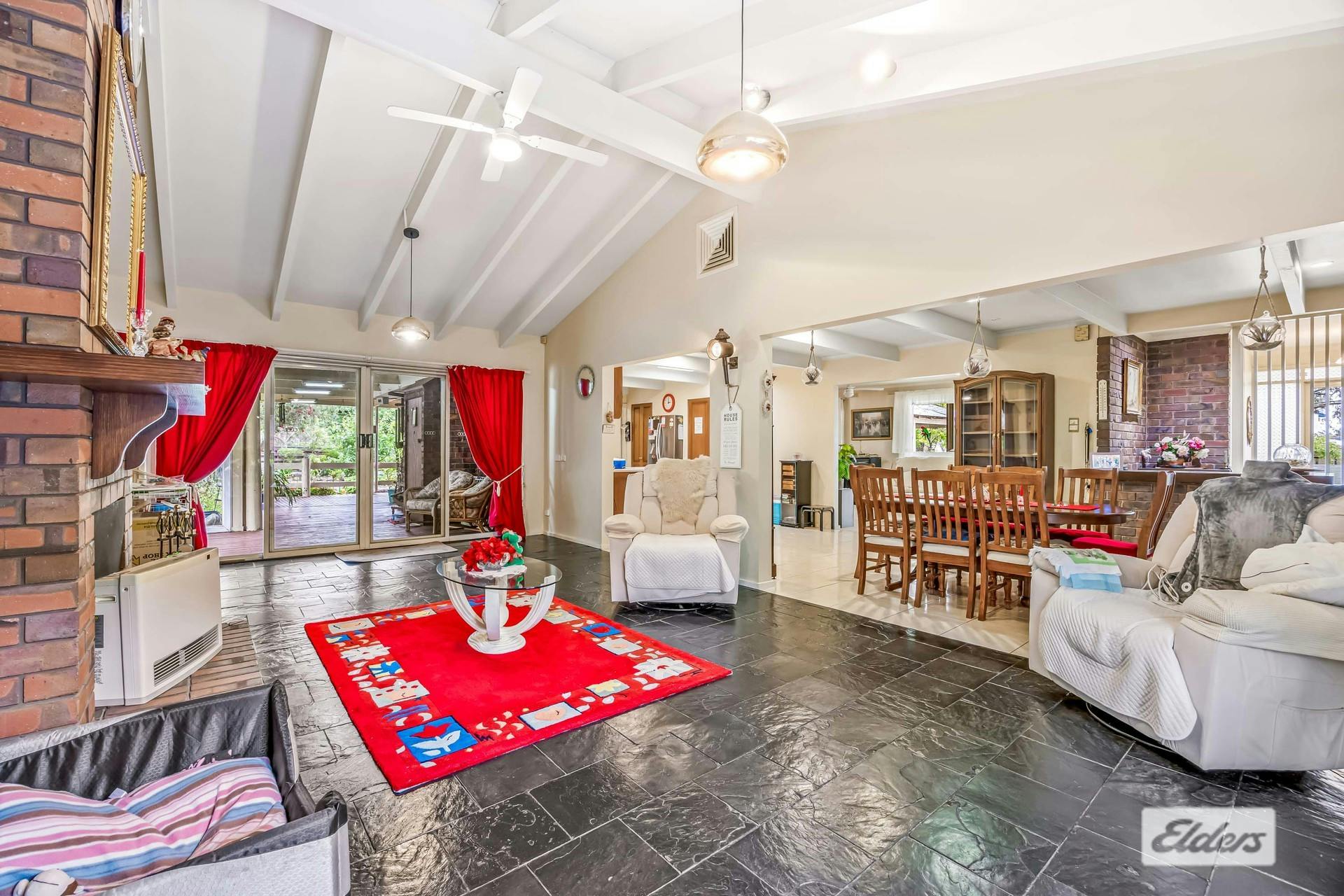 Inside, the home welcomes you with a generous open-plan living area boasting cathedral ceilings, an open fireplace, evaporative cooling, and a ceiling fan.