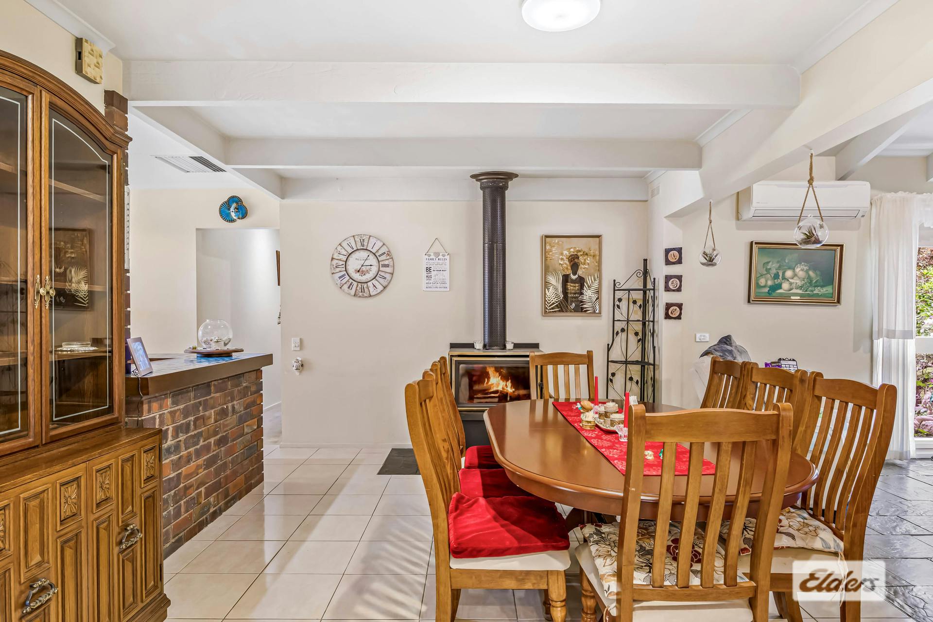 The updated timber kitchen includes a gas cooktop, double electric oven, dishwasher, and overlooks the dining area, which features wood heating and a built-in bar.