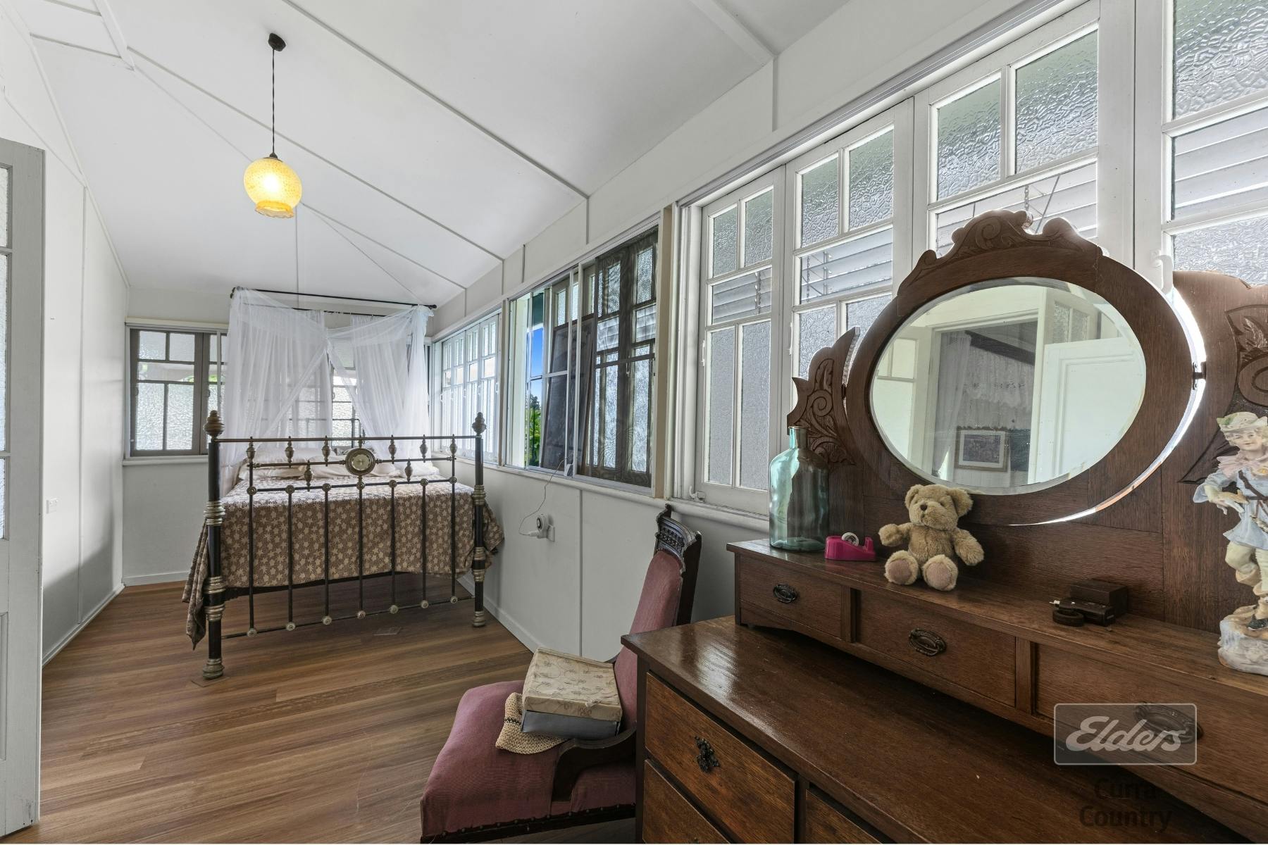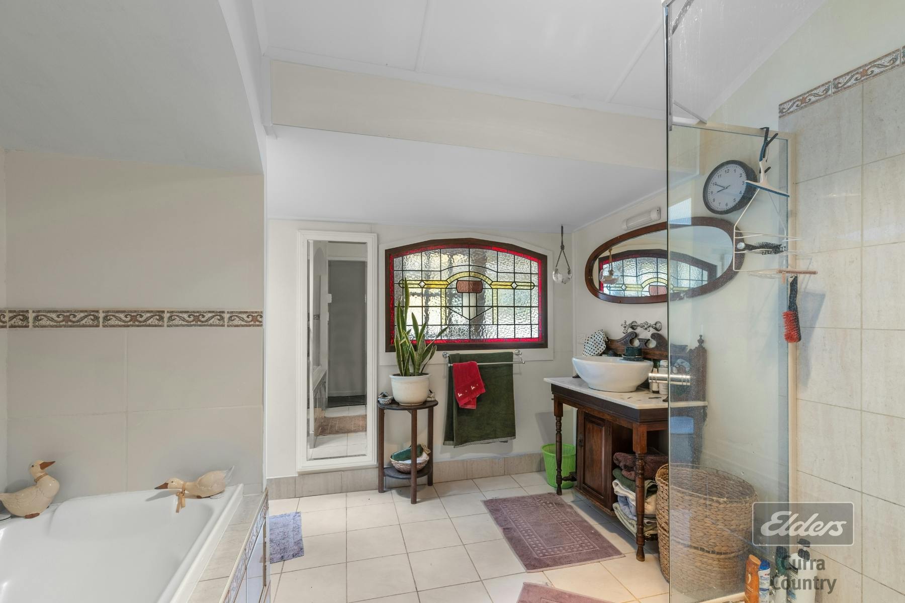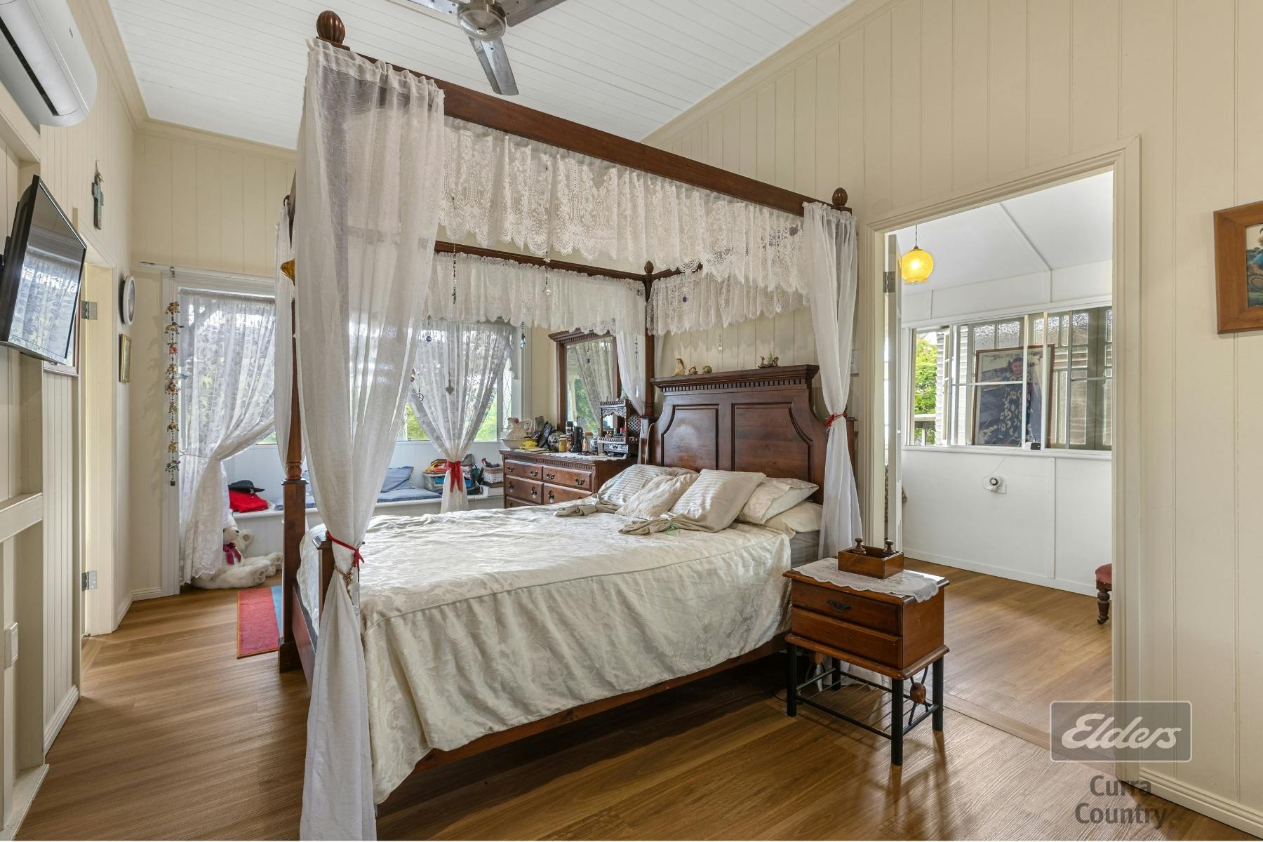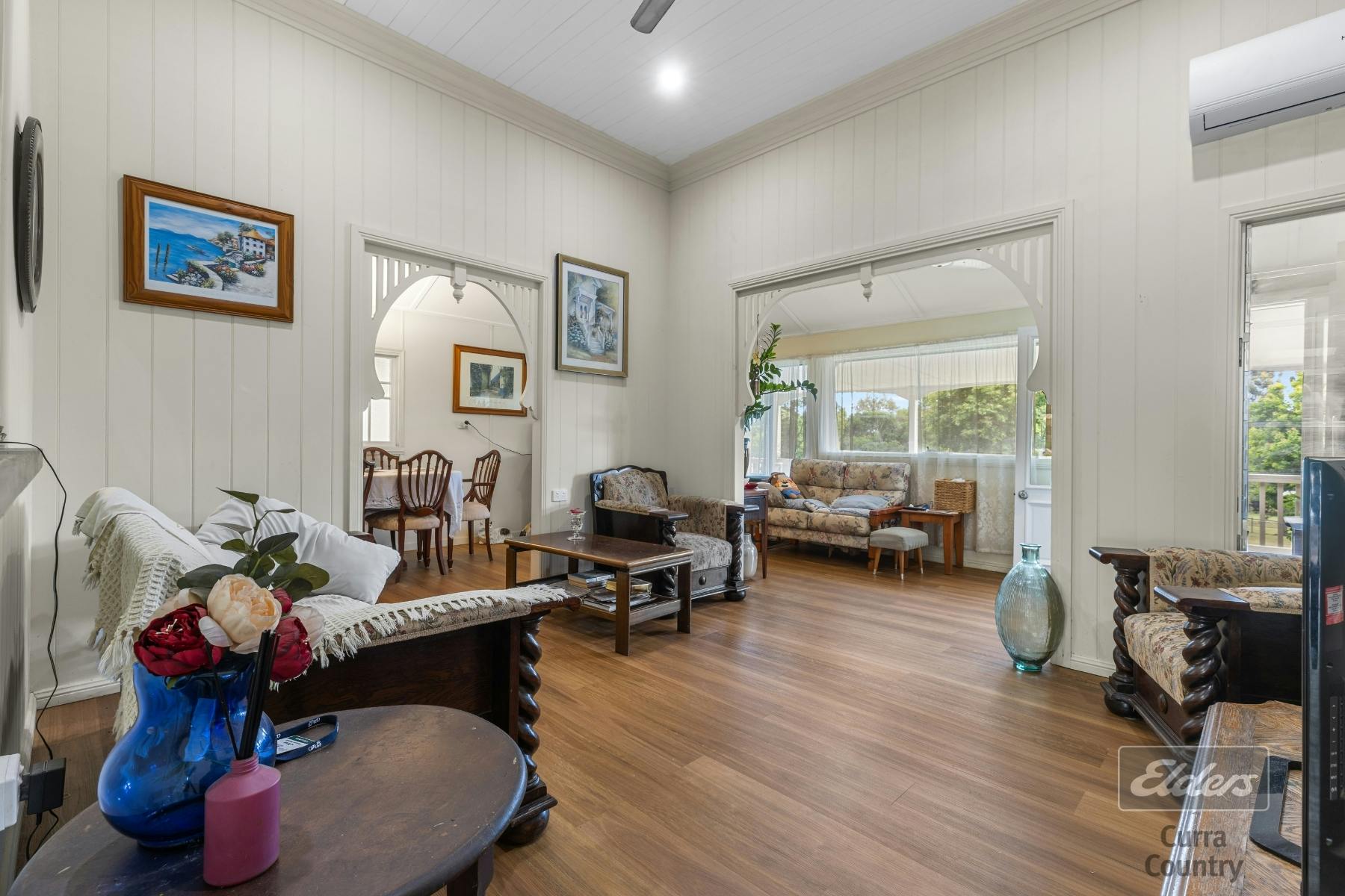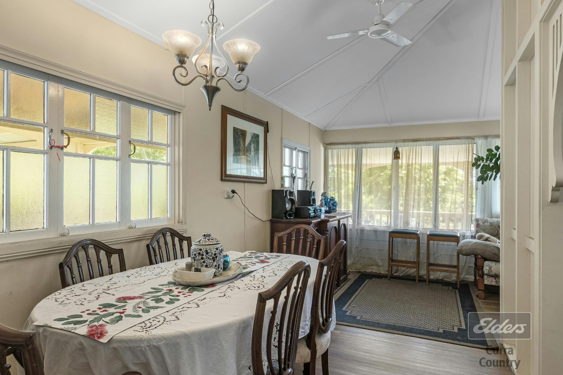 The main bathroom is generously proportioned, complete with a large bath and beautiful stained glass windows. Comfort is guaranteed throughout the home with ceiling fans and air-conditioning, while the classic country kitchen boasts ample bench space, original hardwood cabinetry, and a dining area that flows seamlessly into the living spaces.