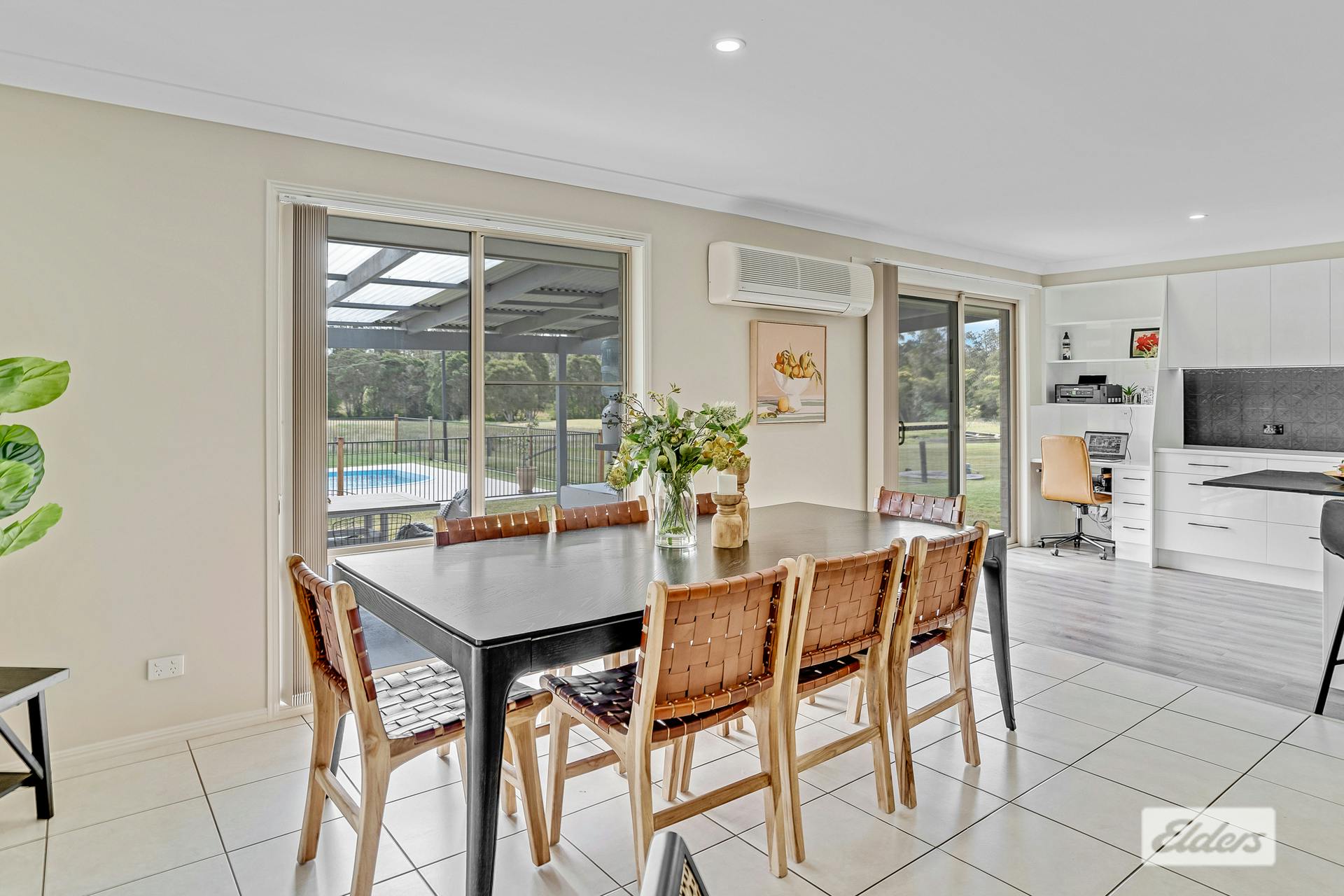 Light filled open plan family, meals and kitchen area makes for a terrific living space. Split system air conditioning ensures year-round comfort. Very handy office nook to the side of the kitchen.
