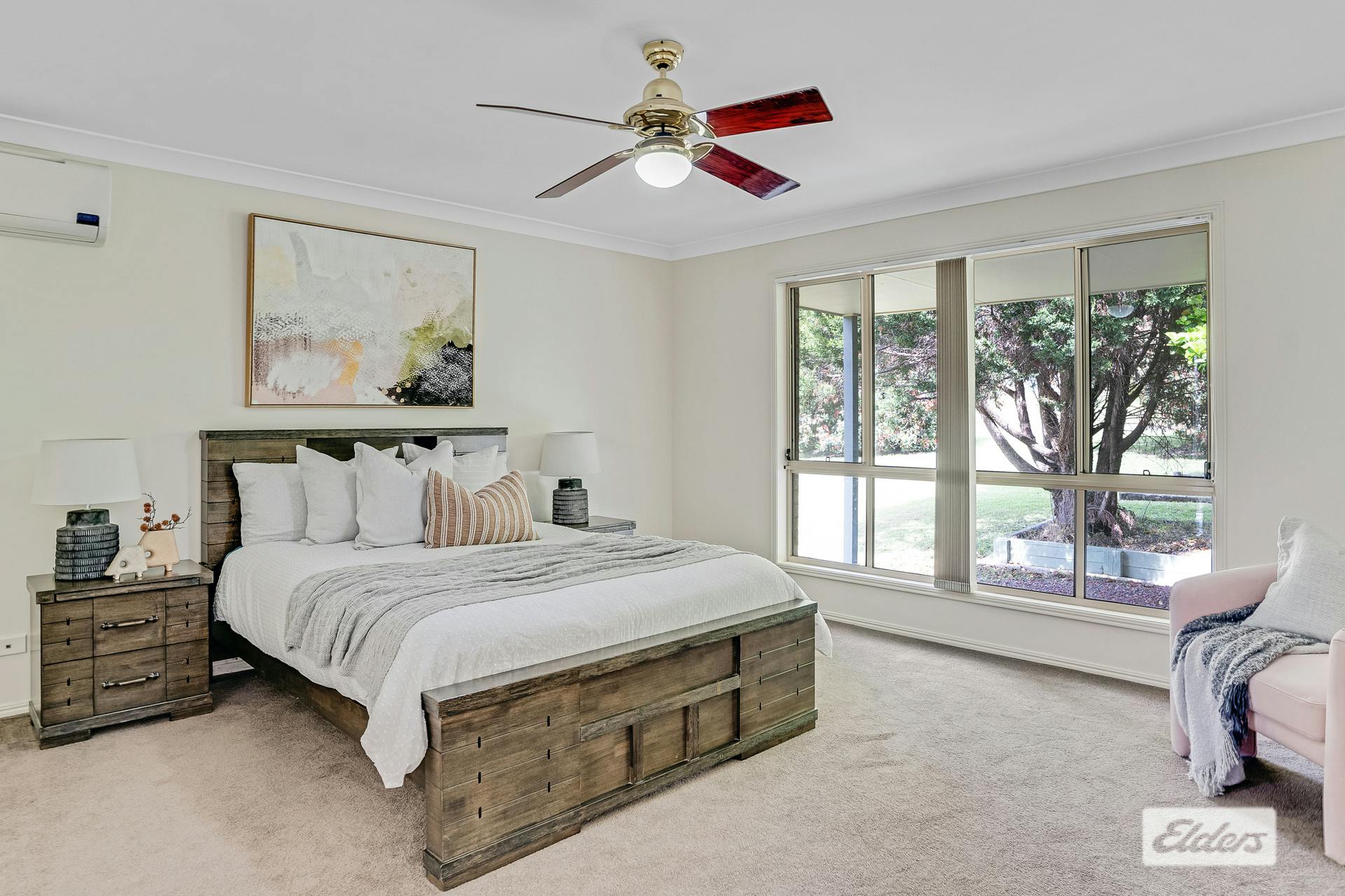 Master suite boasts a walk-in robe, linen press, large ensuite, air conditioning & fan.